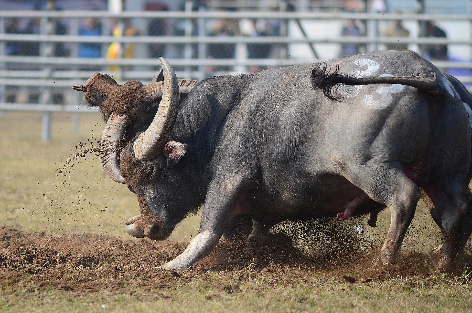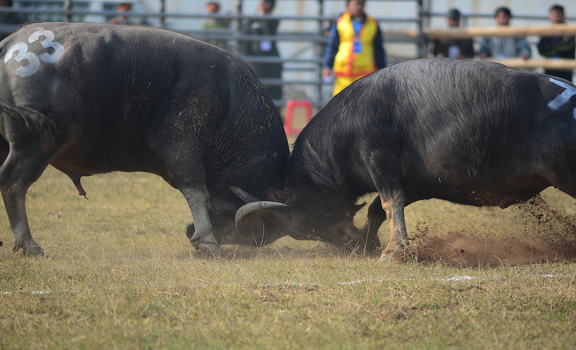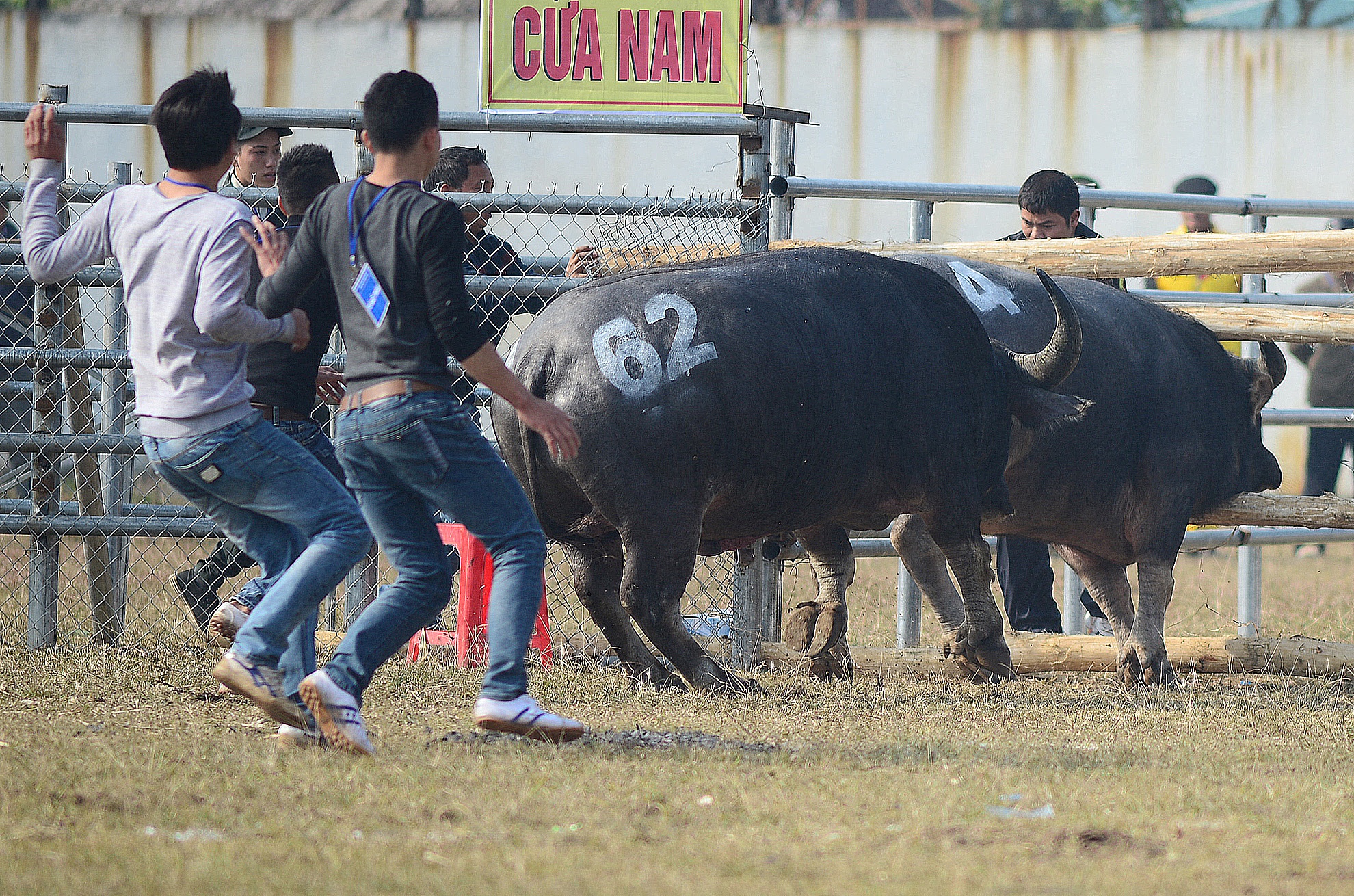 | Tiếp sau đó cũng có một pha hai đối thủ dồn nhau vào nơi có che chắn tạm bợ. Trâu số 62 của ông Khuất Văn Dũng (Sen Chiểu, Phú Thọ) dồn trâu số 14 vào hàng rào. |