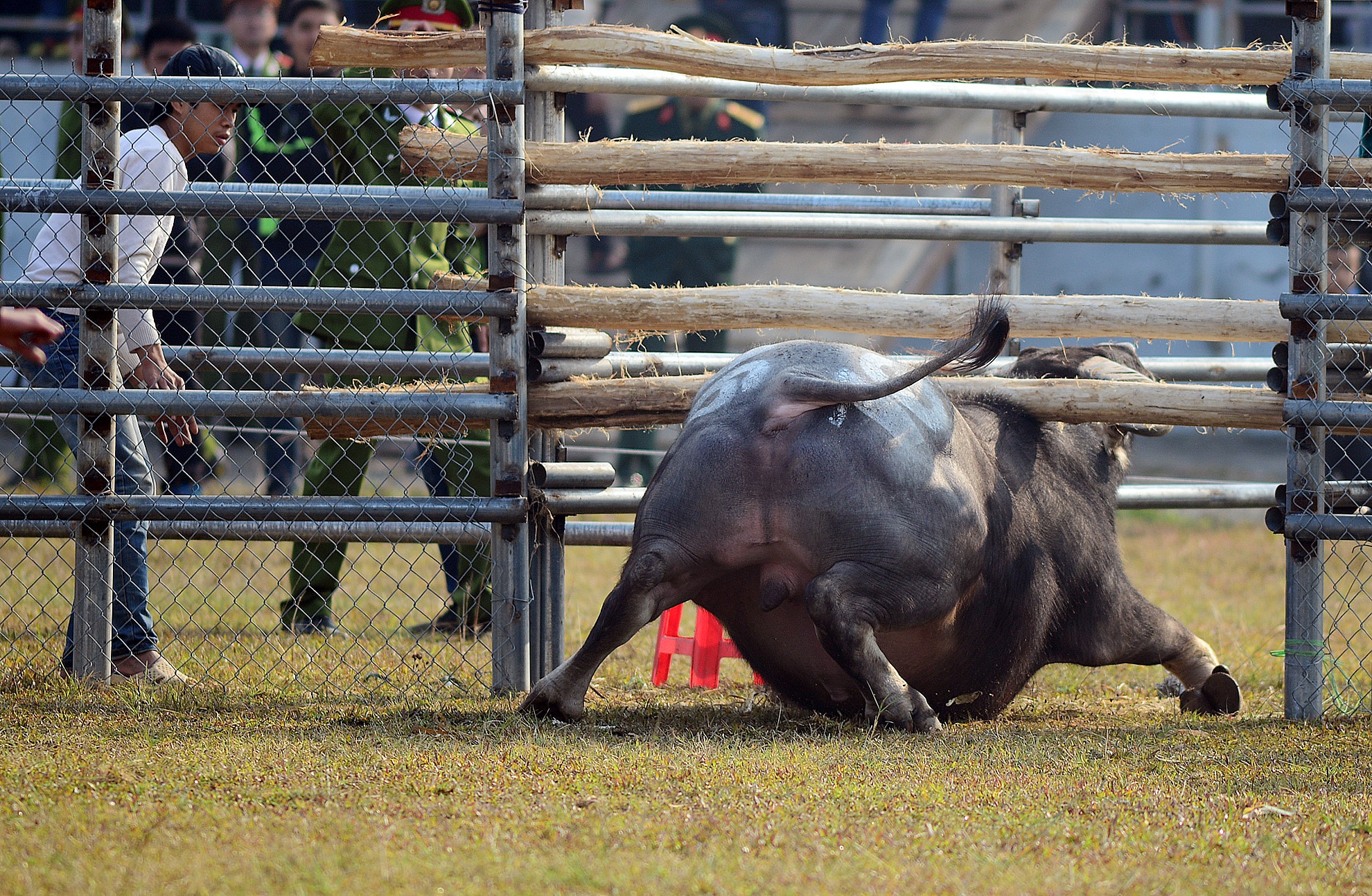 Khi mới vào trận một 'ông trâu' chưa kịp ra đòn đã quay đầu tìm lối chạy thoát bằng cách chui ra hàng rào khiến khán giả bật cười trên sân vận động Phúc Thọ (Hà Nội).
