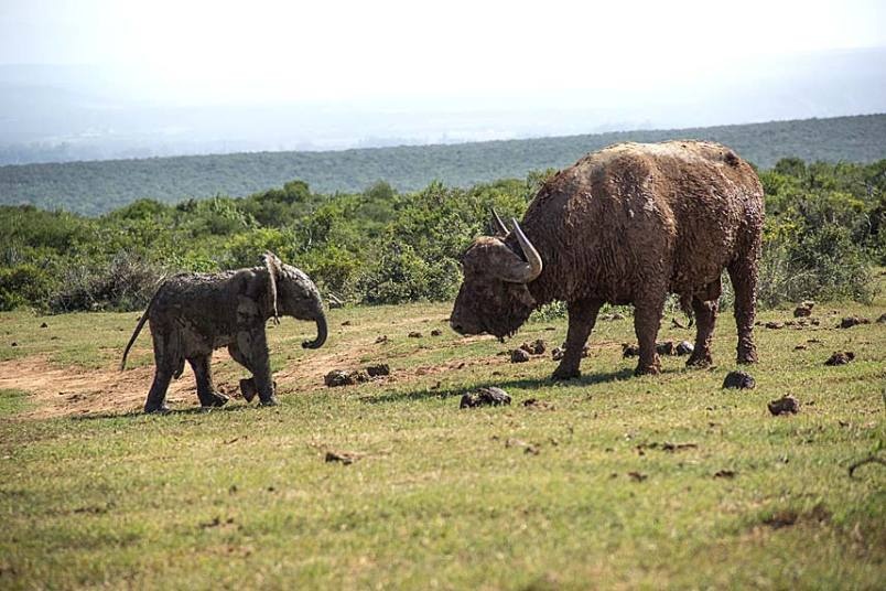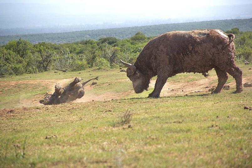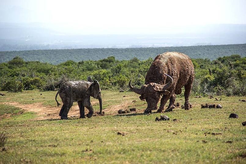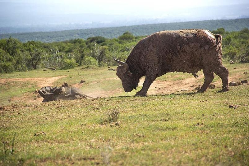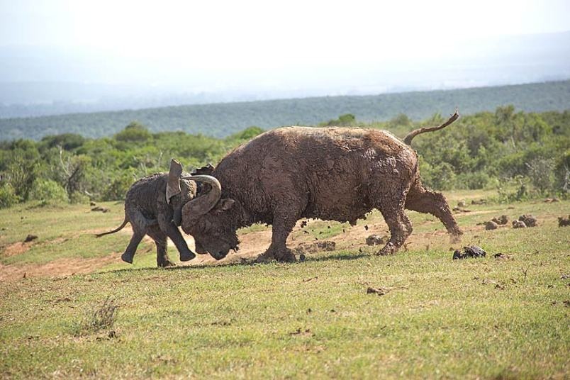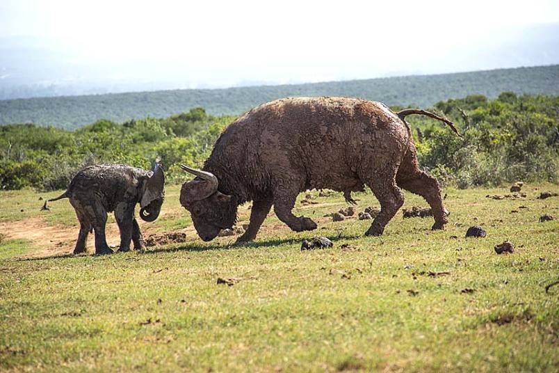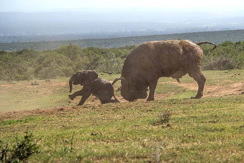 Vụ việc xảy ra gần một hố nước tại công viên Quốc gia loài voi Addo, Nam Phi. Con voi con ngênh ngang đối đầu trâu rừng trưởng thành.