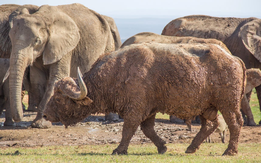 Sau vụ tấn công, con trâu thản nhiên đi qua khu vực bầy voi trưởng thành.