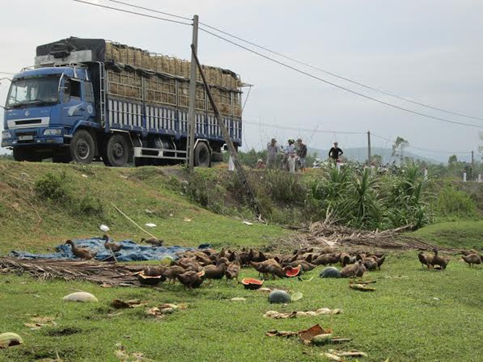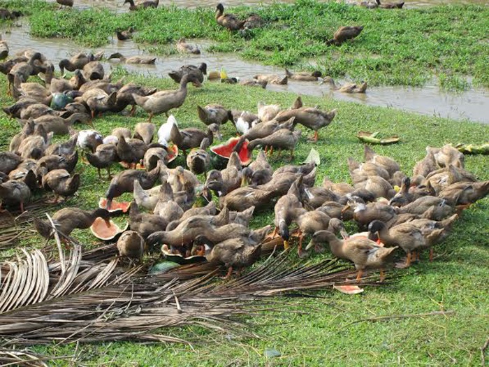 | Một nông dân ở xã Tịnh Trà (huyện Sơn Tịnh) đập vỡ dưa hấu cho vịt rỉa. |