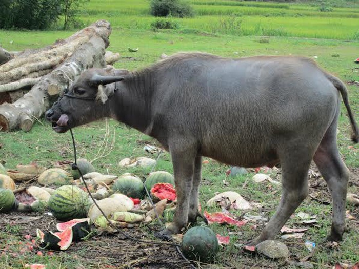 | Con trâu này không thèm để ý mấy quả dưa chín mọng dưới chân. |