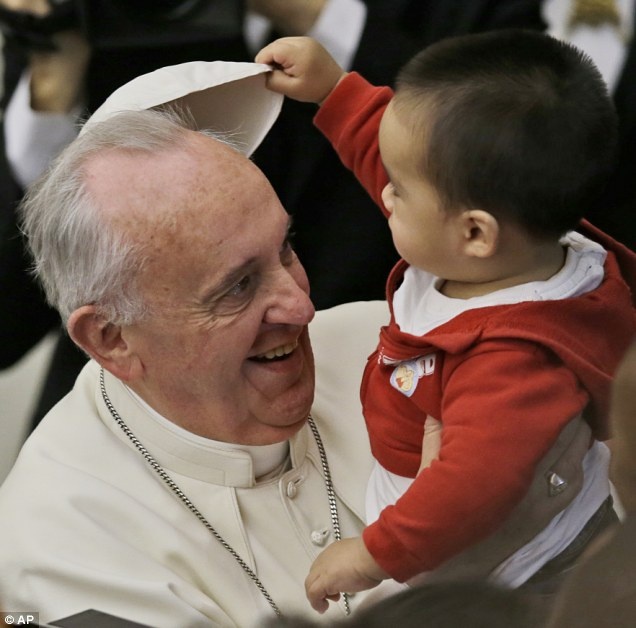 | Đức Thánh Cha chỉ cười khi đứa trẻ lột chiếc mũ của ngài. Ảnh: AP |