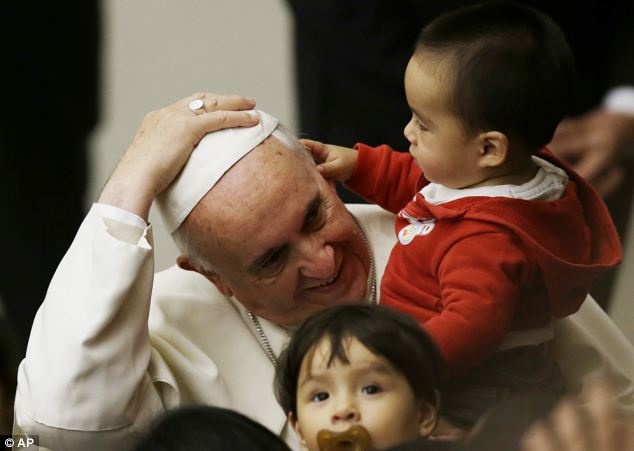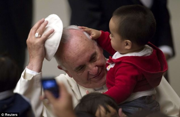| Nhưng đột nhiên Giáo hoàng lấy lại chiếc mũ từ tay đứa trẻ và để nó vào vị trí ban đầu. Ảnh: Reuters |