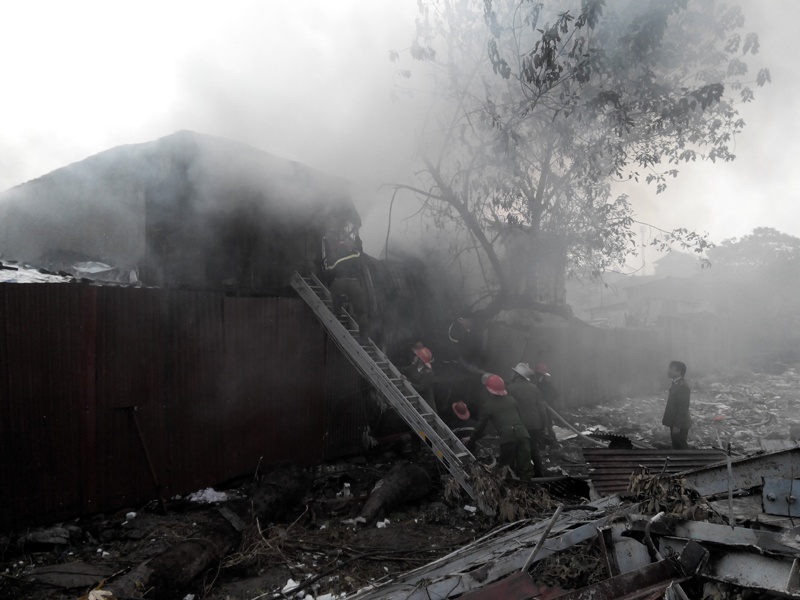 | Trước đó, có 4 xe cứu hỏa được điều đến hiện trường. Lực lượng PCCC dùng thang sắt để trèo lên phía trên khu nhà cháy để tiến hành dập lửa. |