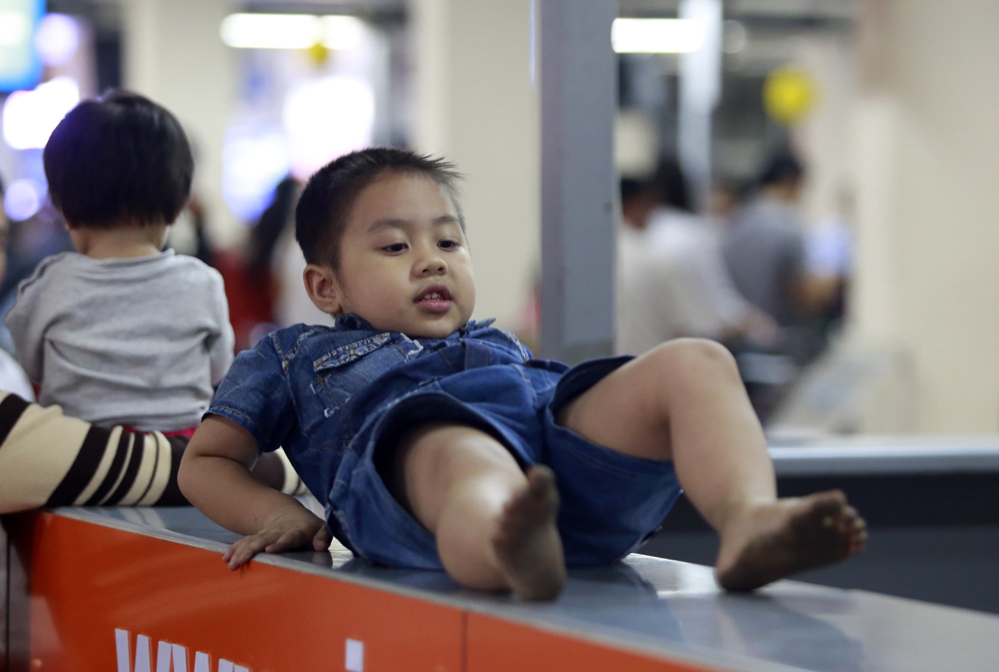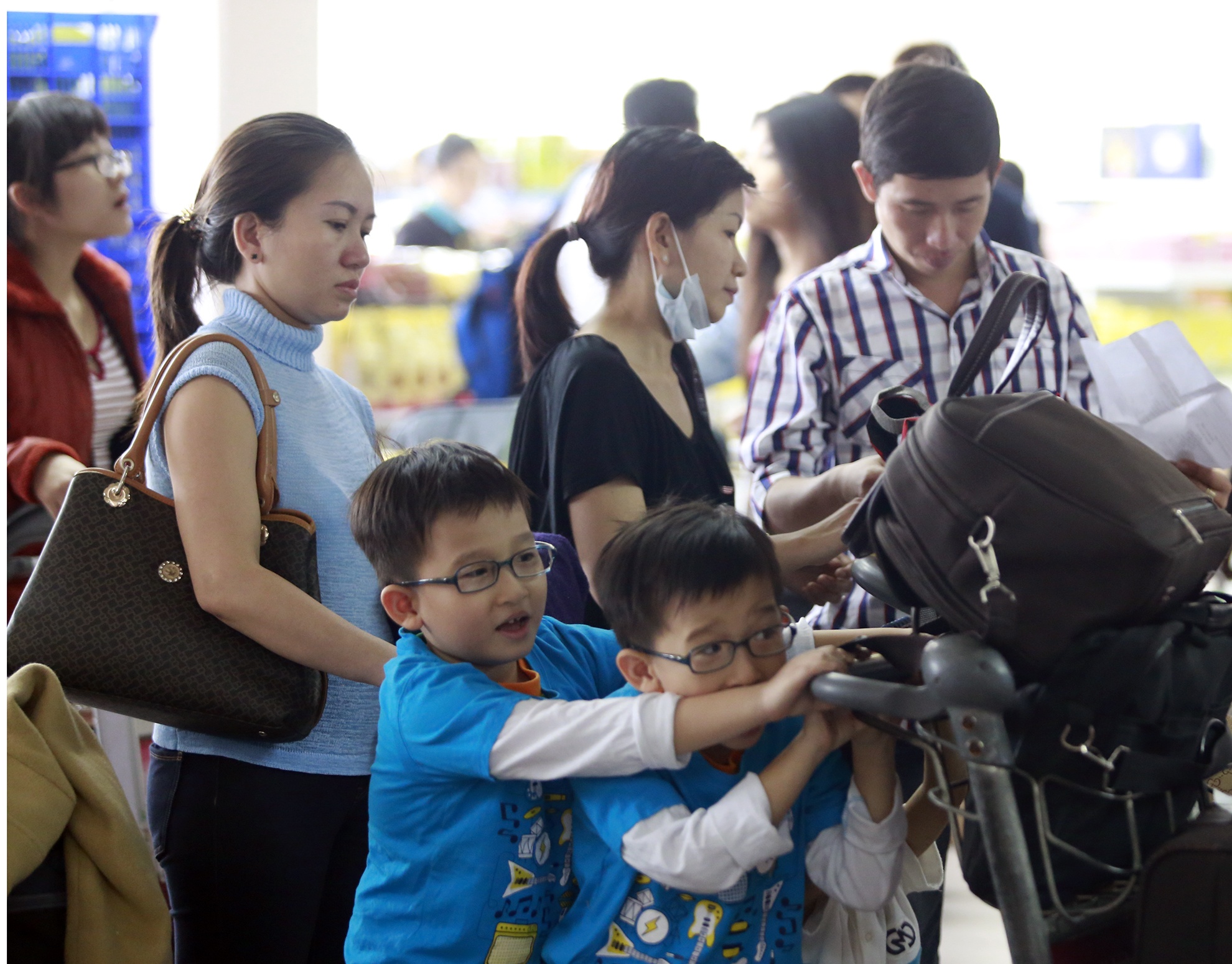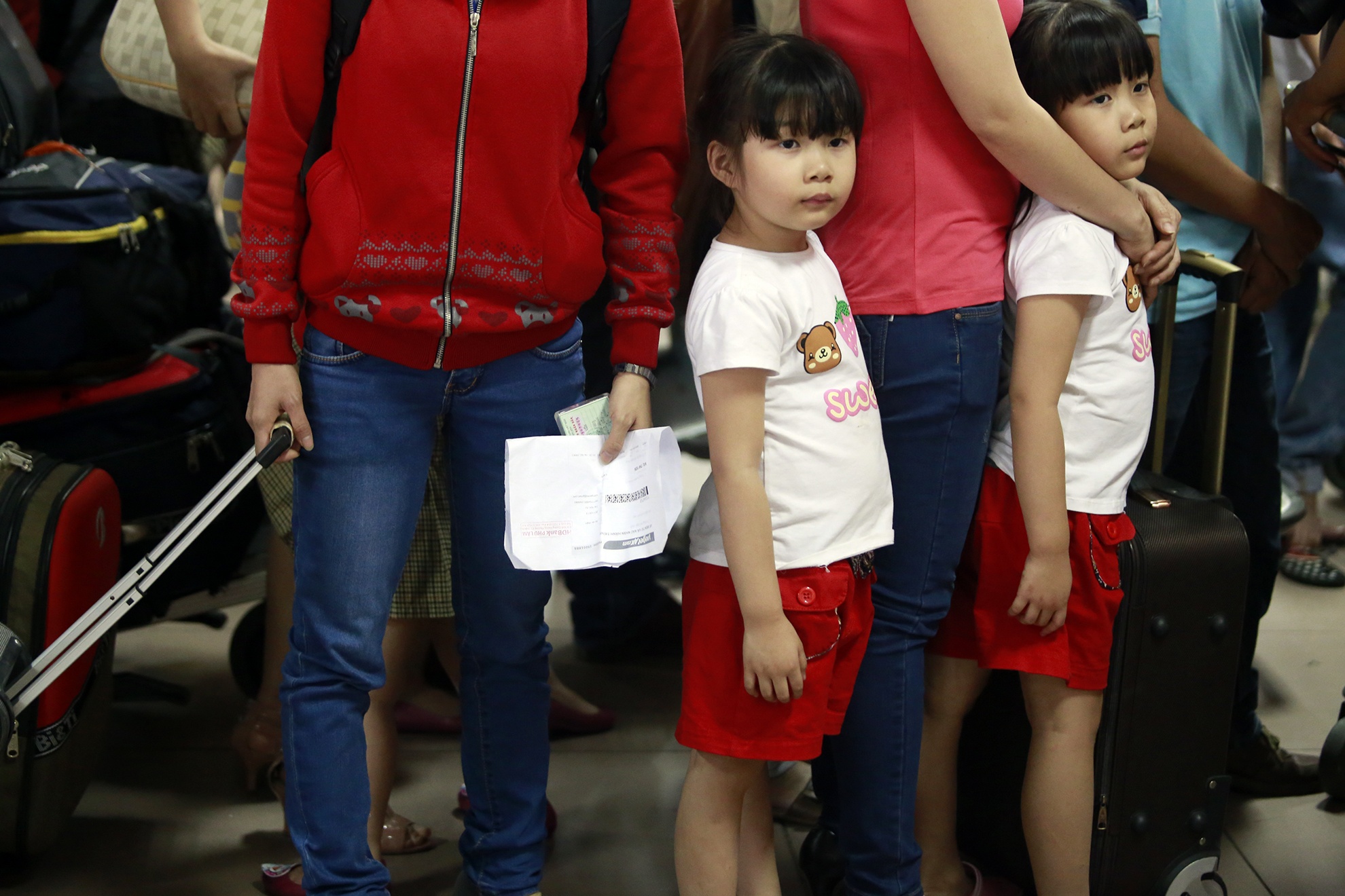 | Các em phải xếp hàng cả giờ cùng cha mẹ do quá đông hành khách bay vào những ngày cận Tết Nguyên đán. |