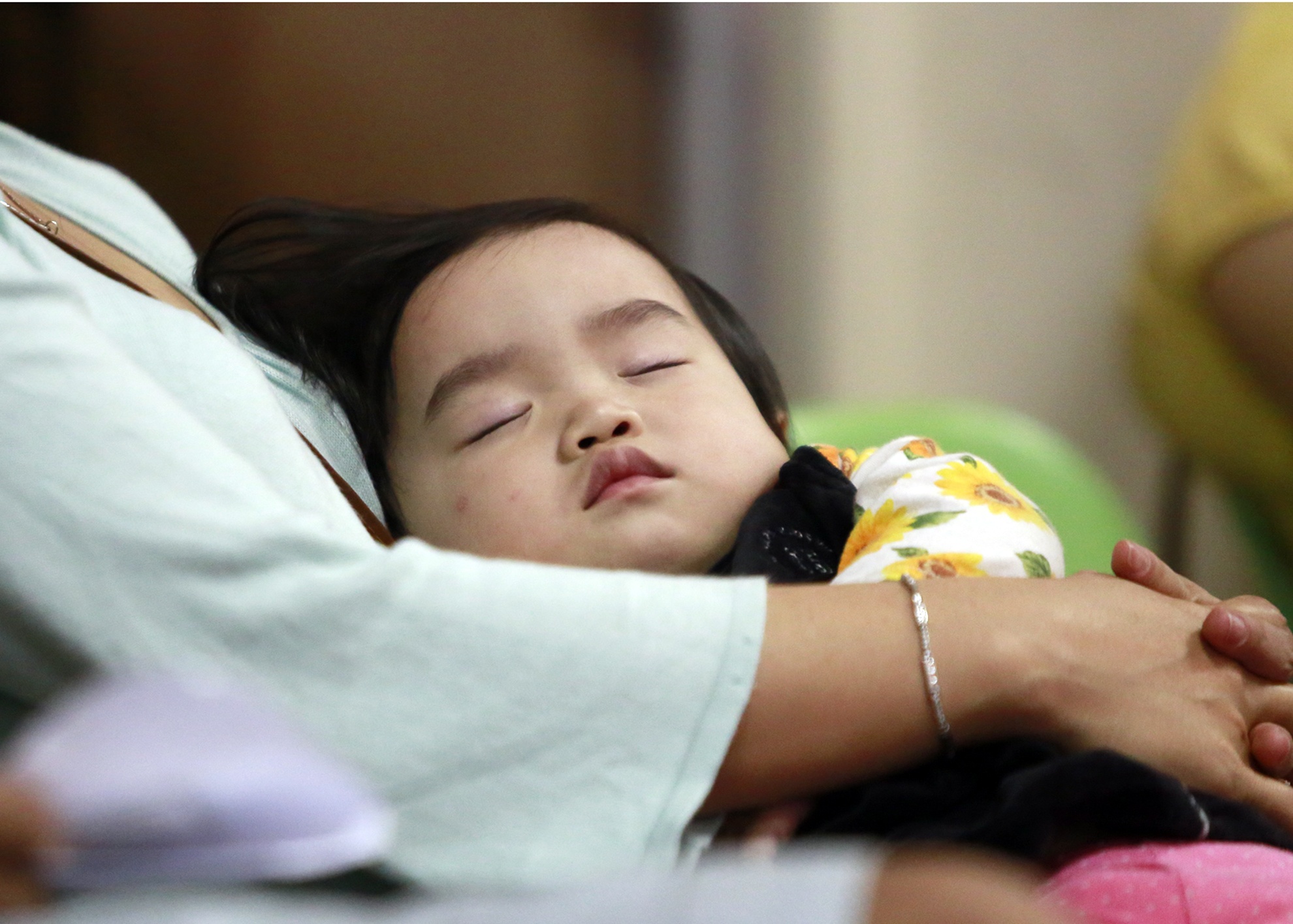 | Bé Bảo Ngọc (17 tháng tuổi) cùng mẹ bay ra Thanh Hóa lúc 12h10 ngày 25/1, nhưng chuyến bay bị hủy nên ngủ trên tay mẹ chờ hãng xếp lại lịch. |