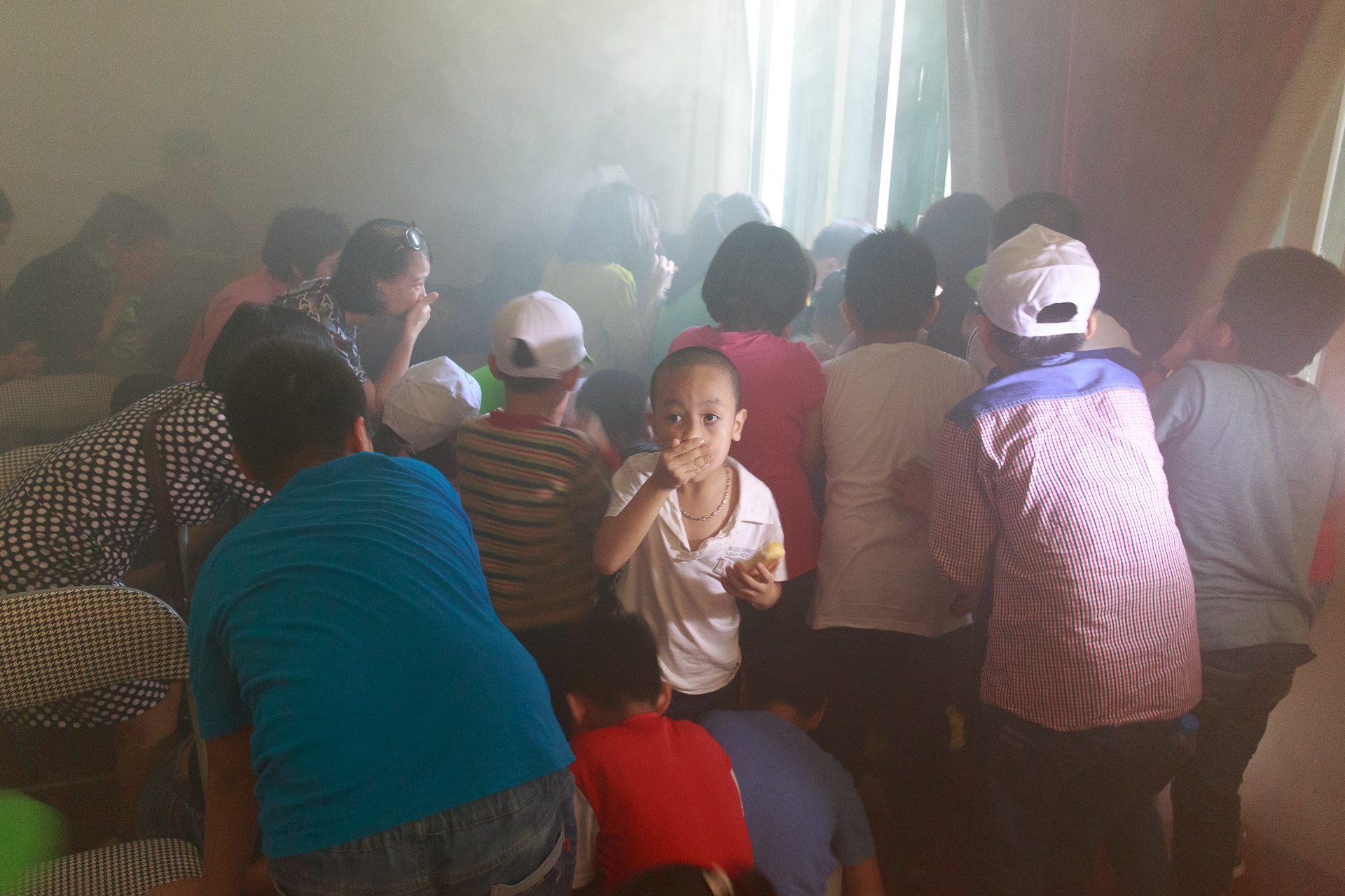 Mở đầu buổi học kỹ năng này, nhóm giảng viên đưa học sinh vào phòng kín và yêu cầu tất cả nhắm mắt để nghe kể chuyện. Sau đó, họ bất ngờ tạo ra đám cháy giả (bằng khói không độc) và hô hoán để các bé chạy ra ngoài. Cửa chính bị kẹt khiến cảnh tượng chen lấn hỗn độn. Có em bật khóc vì quá sợ hãi.