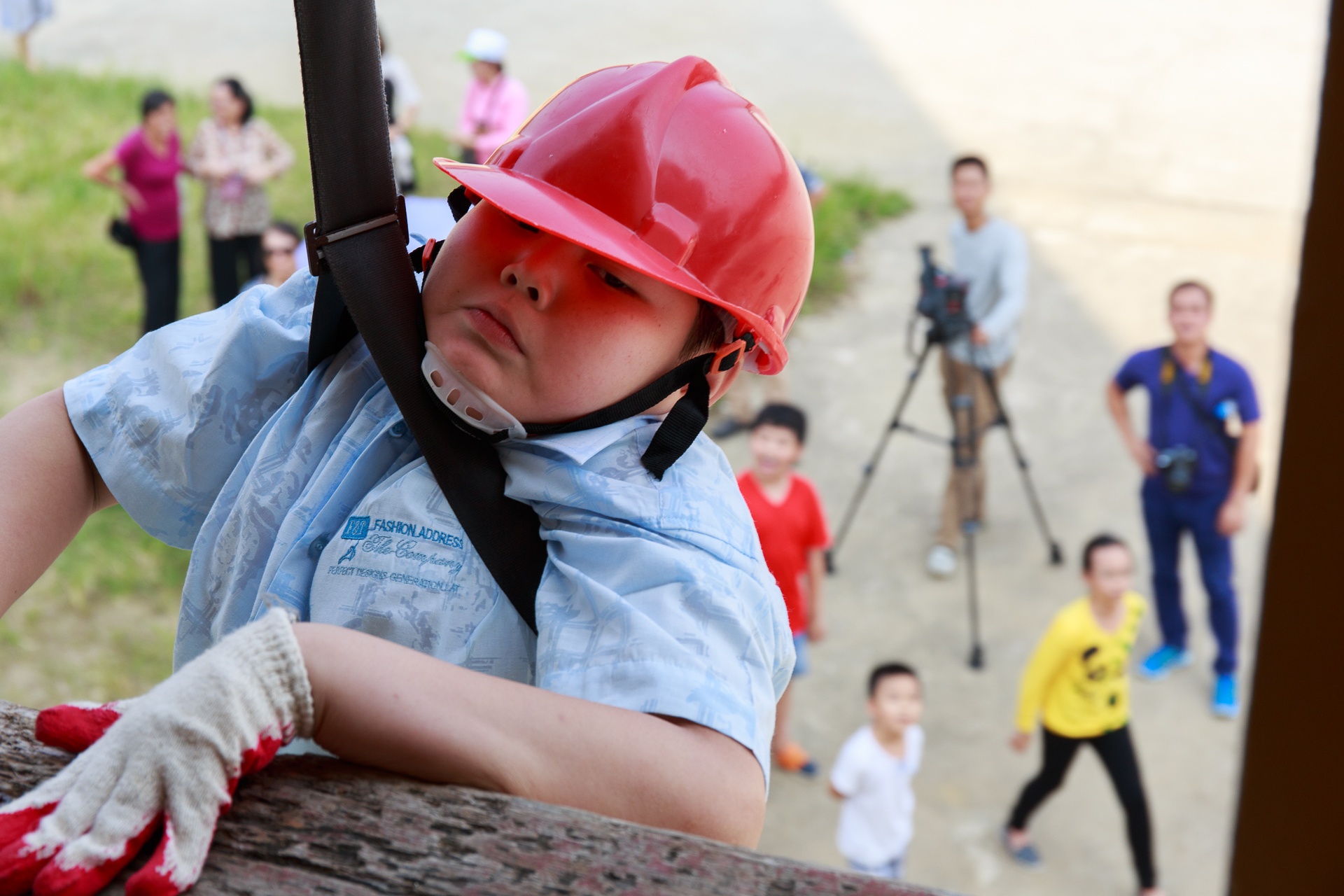 Khuôn mặt căng thẳng của bạn Nguyễn Hoàng khi lần đầu bị treo lơ lửng ở tầng 3. Sau khi xuống mặt đất an toàn, Hoàng tỏ ra thích thú và muốn trải nghiệm thêm lần nữa.