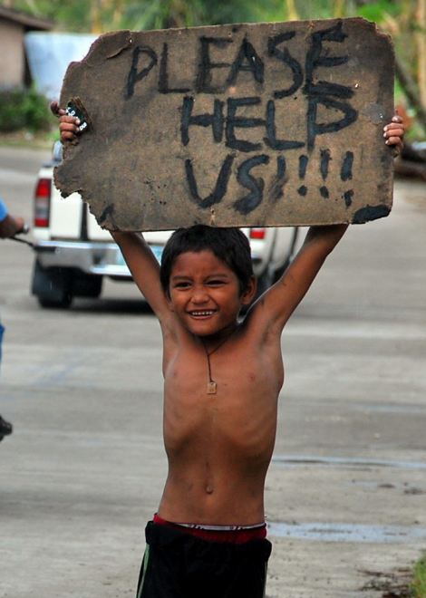 Một bé trai giơ bảng: "Hãy giúp chúng tôi" tại thành phố Tacloban sau bão. Những người sống sót sau thiên tai đang vật lộn để sinh tồn. Nhiều người phải qua đêm ngoài trời dưới mưa. Ảnh: EPA.