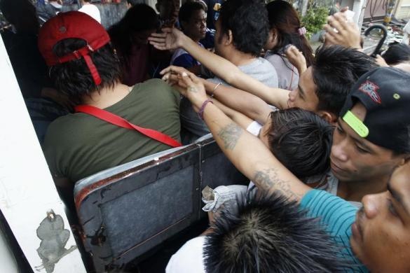| Người sống sót chen nhau xin thuốc từ một chiếc xe tải tại Tacloban ngày 10/11. Ảnh: Reuters. |