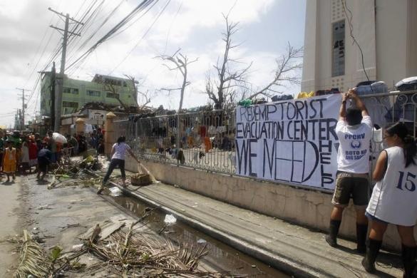 | Những người sơ tán căng bạt có nội dung cần giúp đỡ bên ngoài khu sơ tán trong nhà thờ ở Tacloban. Ảnh: Reuters. |