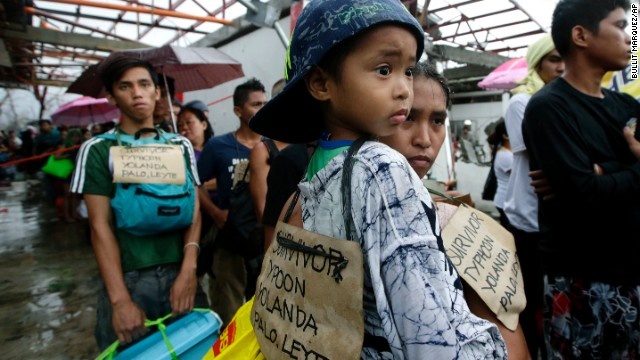 Dòng chữ “người sống sót sau siêu bão Yolanda (tên quốc tế là Haiyan) ở thị trấn Palo, tỉnh Leyte” trên cổ một đứa bé. Ảnh: CNN.