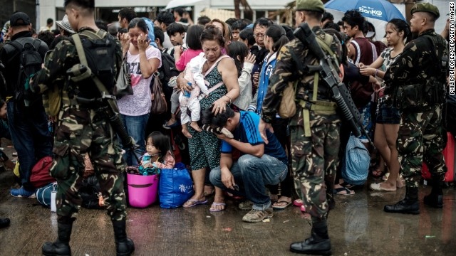Những đứa trẻ chờ đợi cơ hội sơ tán cùng gia đình tại sân bay Tacloban ngày 12/11. Họ là những người may mắn khi vượt qua những khu vực mà siêu bão tàn phá nặng nề nhất để tới đây. Ảnh: CNN.