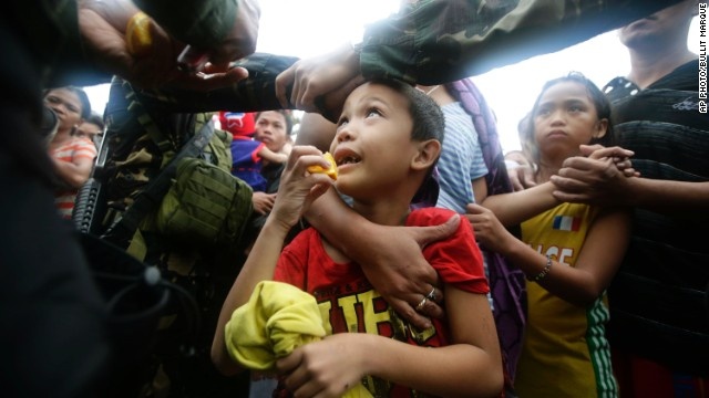 Đứa trẻ cầm miếng cam mà binh sĩ Philippines cho. Có thể đây là lần đầu tiên cậu bé tội nghiệp phải chịu đói khát lâu đến vậy, nhưng em vẫn may mắn hơn rất nhiều đứa trẻ tử nạn vì siêu bão hay đang quắt quay đợi chờ sự giúp đỡ ở những khu vực xa xôi. Ảnh: CNN.