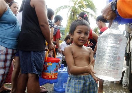 Cậu bé xin nước giúp gia đình tại một điểm phân phát hàng cứu trợ ở thành phố Tacloban. Rất có thể gia đình em chẳng còn đủ người để xin nước, xin lương thực hay các nhu yếu phẩm khác nên cậu bé phải mang bình nước to bằng chính cơ thể em. Ảnh: Reuters.
