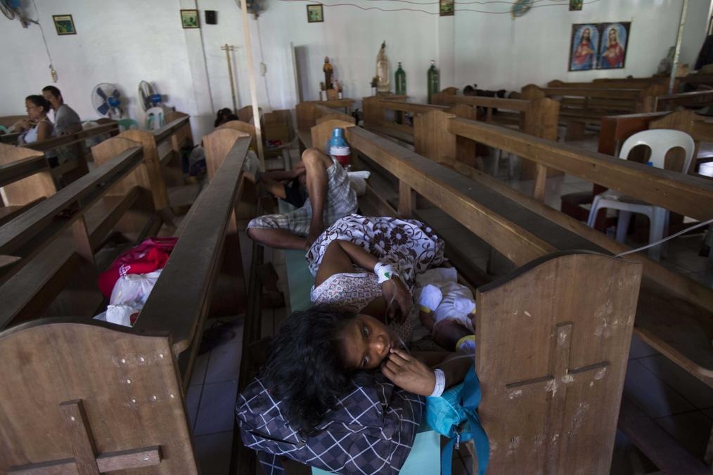 | Cha, mẹ của những đứa trẻ nghỉ ngơi trên những ghế gỗ trong nhà thờ tại thành phố Tacloban, tỉnh Leyte. Ảnh: AP. |