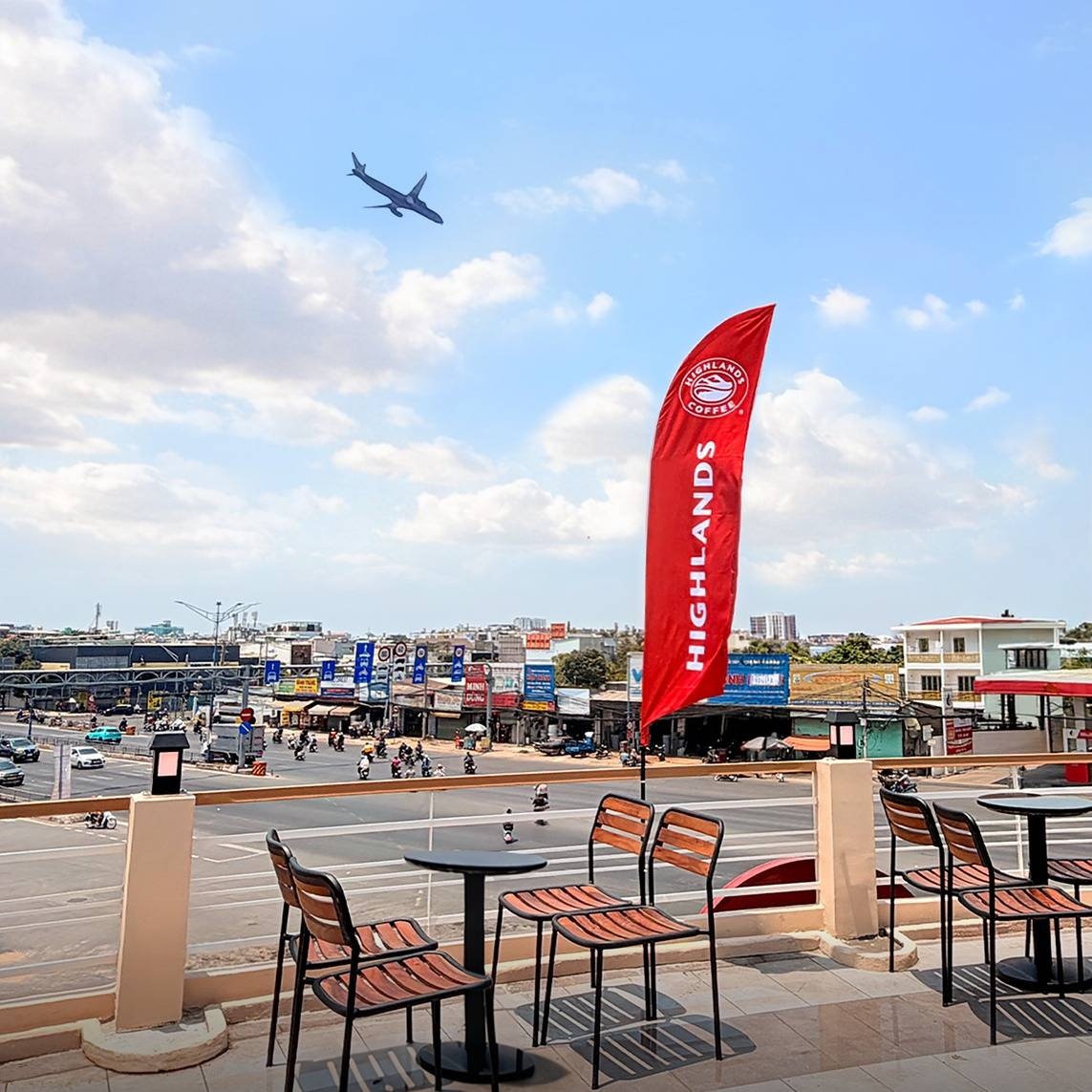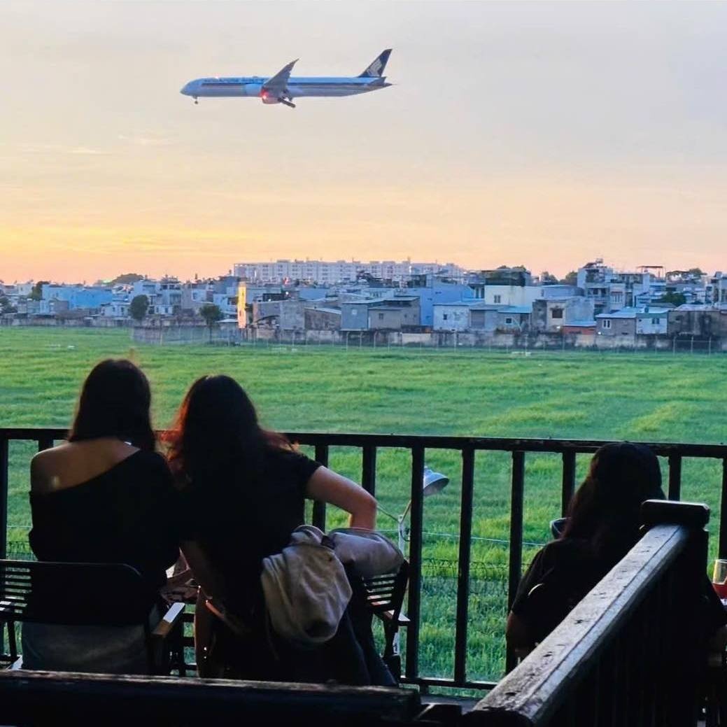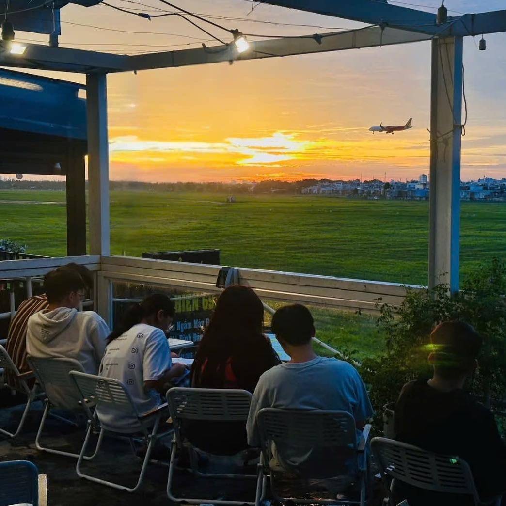Từ vị trí của quán, máy bay xuất hiện khá rõ trong tầm mắt, đặc biệt vào buổi chiều khi ánh hoàng hôn phủ xuống tạo cảm giác rất “điện ảnh”. Không gian rộng, phù hợp đi nhóm hoặc gia đình, vừa uống cà phê vừa ngắm máy bay bay qua trở thành trải nghiệm khiến nhiều người quay lại.