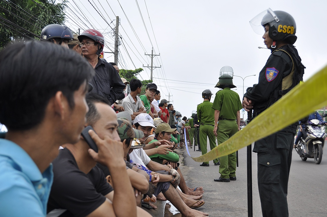 | Sáng sớm 11/8, hàng trăm người dân tụ tập trên quốc lộ 13, trước ngôi biệt thự xảy ra vụ thảm sát 6 người chết (xã Minh Hưng, huyện Chơn Thành, Bình Phước) để theo dõi công tác dựng lại hiện trường. |