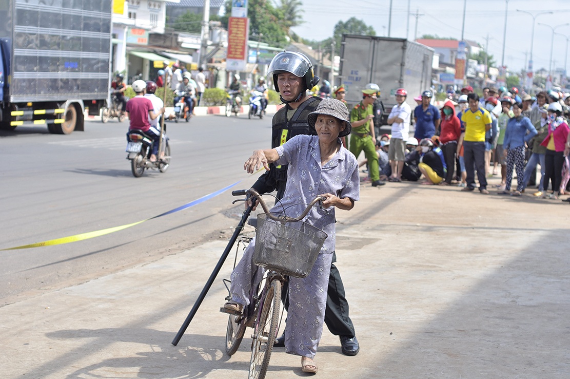 | Hàng chục cảnh sát cơ động sau đó đến phong tỏa hiện trường, giải tán đám đông để đảm bảo an ninh trật tự. Trong ảnh: Một cụ già được chiến sĩ cảnh sát cơ động mời ra khỏi hiện trường. |