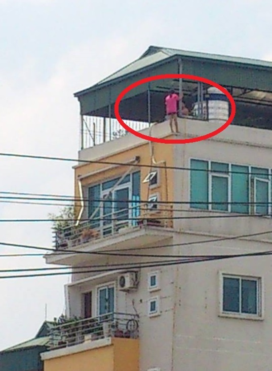 Trưa 3/6, một cô gái mặc áo màu hồng, quần ngắn trèo qua lan can, tay bám vào cột trên tầng thượng tòa nhà 6 tầng số 76 phố Nhổn (Bắc Từ Liêm, Hà Nội) có ý định nhảy xuống.