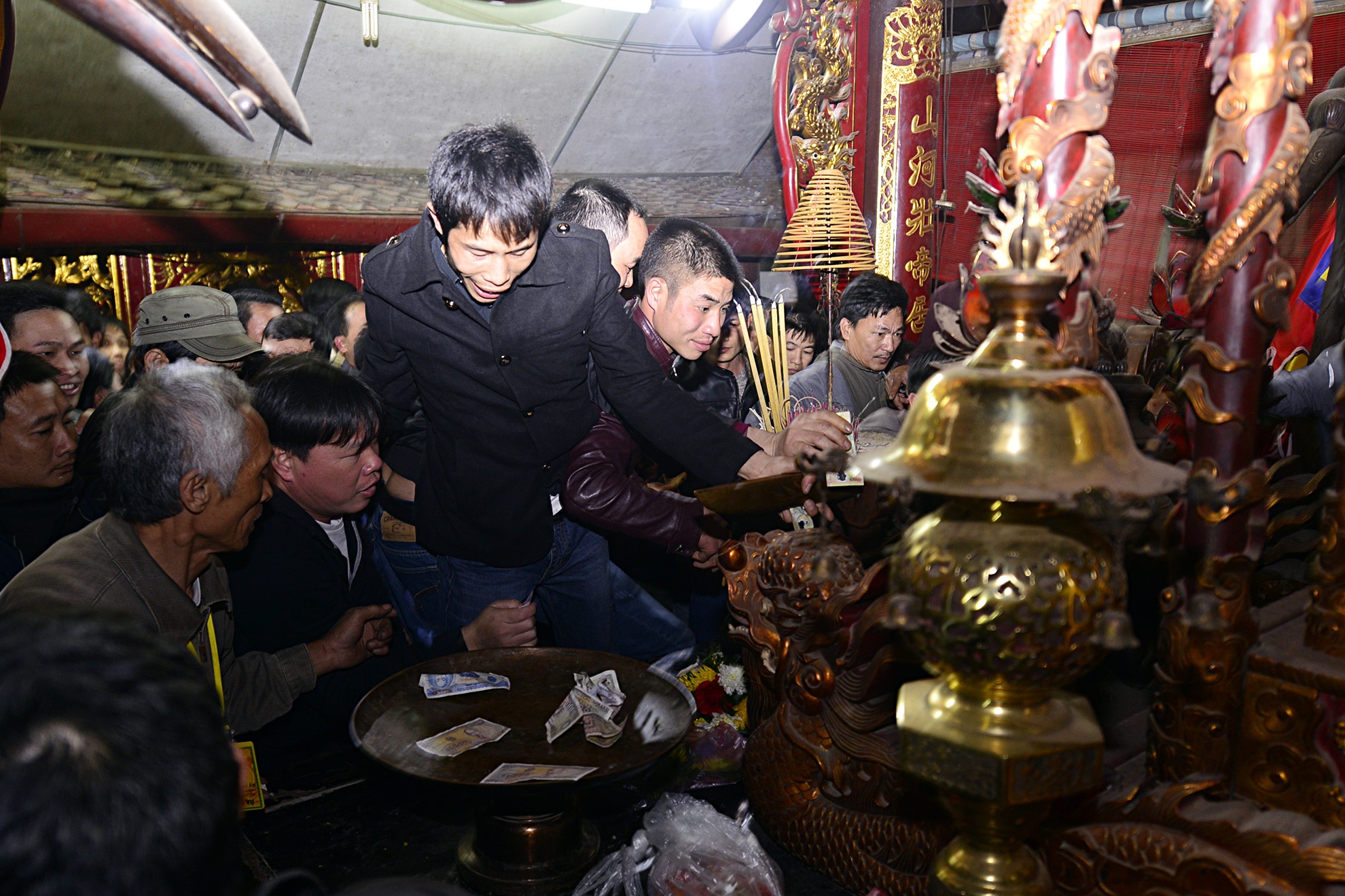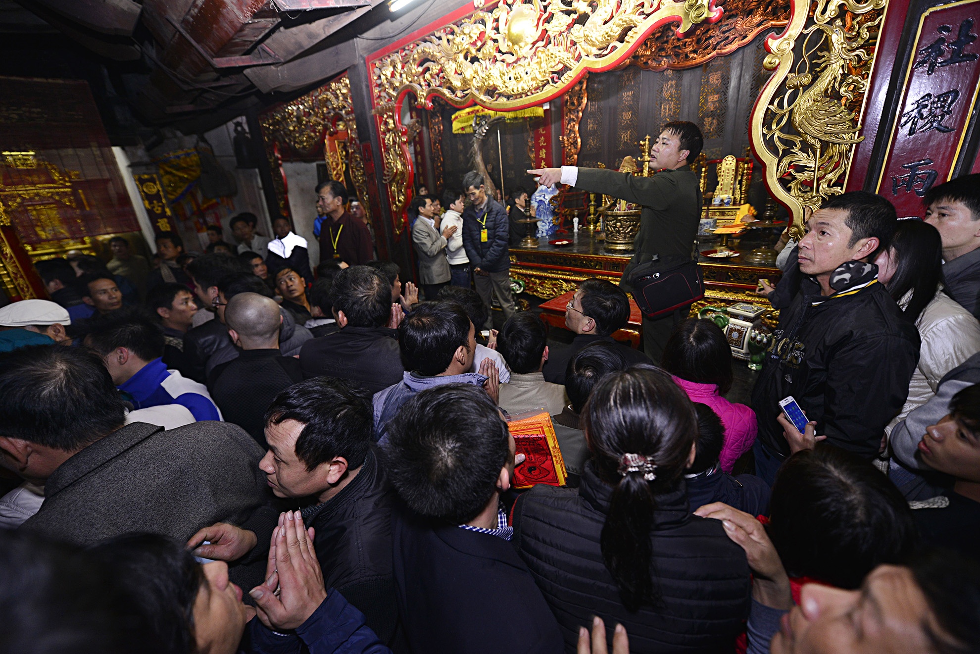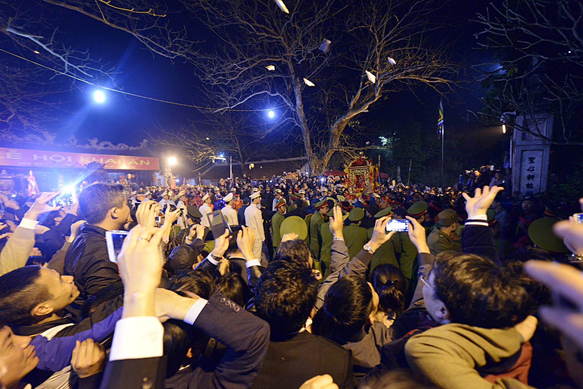 Người dân vứt tiền lẻ, xô đẩy để được chạm vào kiệu khi đoàn đi qua. Lực lượng chức năng phải dựng hàng rào sống, làm việc vất vả mới ngăn được sự rối loạn.
