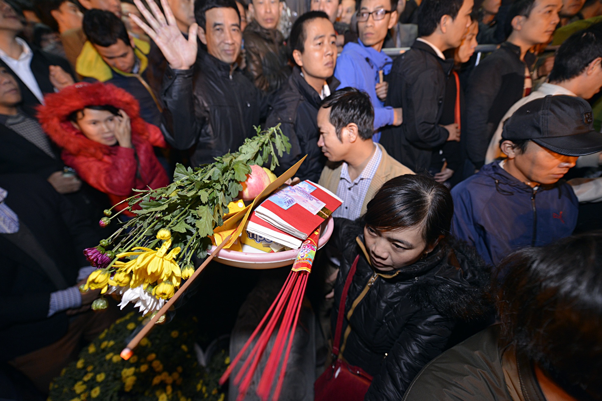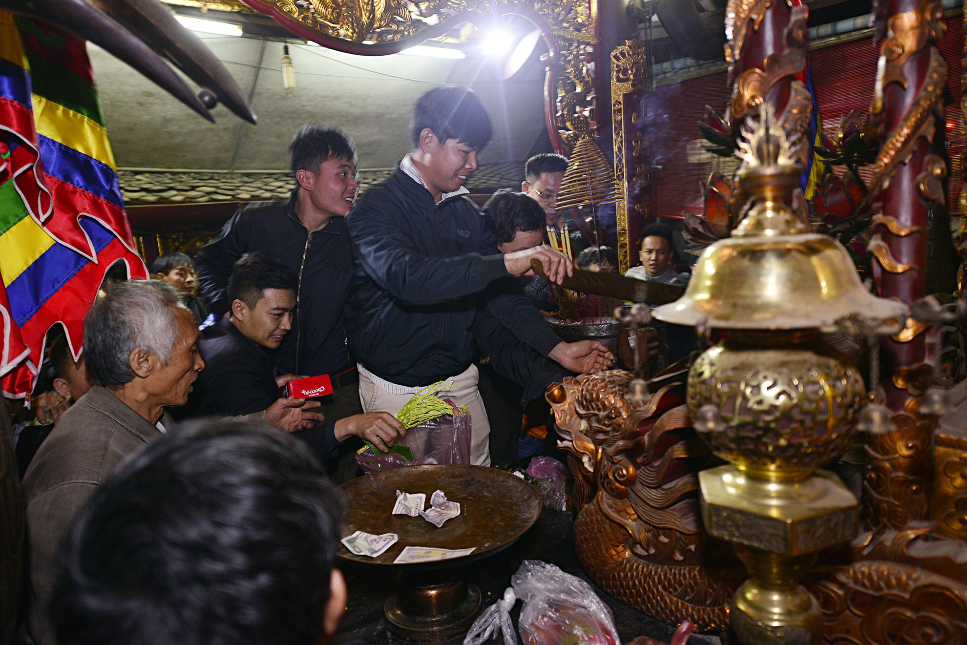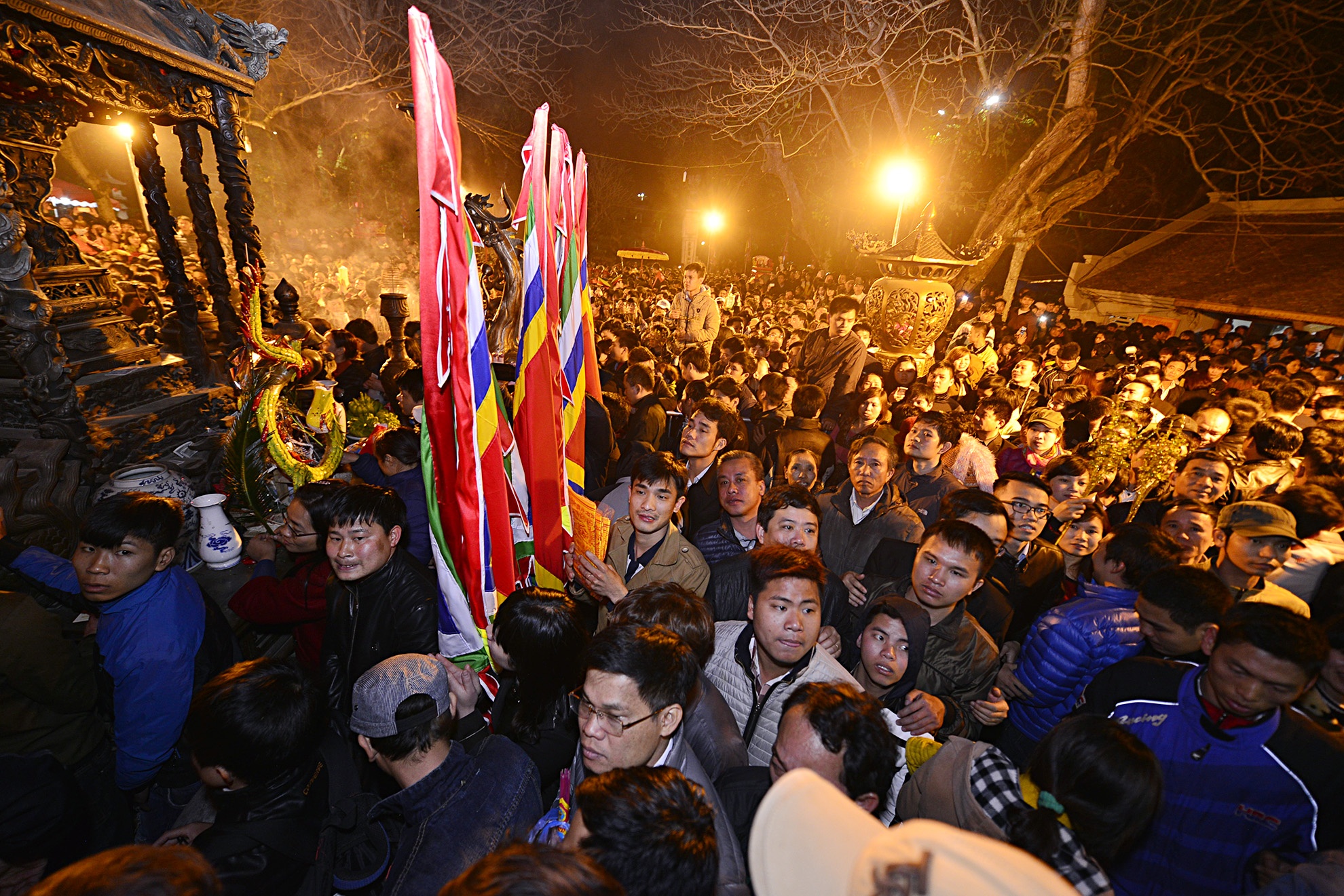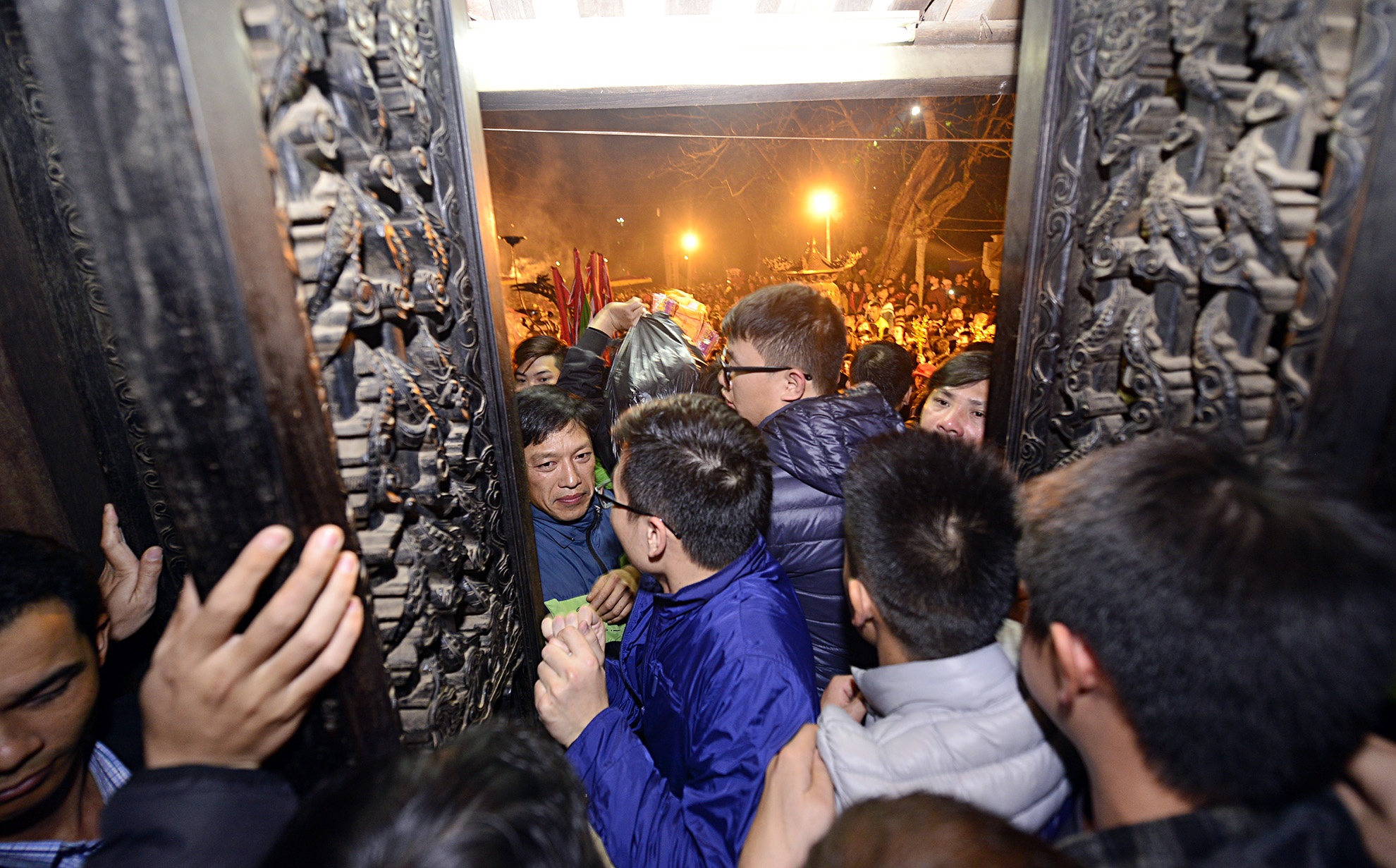 Người dân vứt tiền lẻ, xô đẩy để được chạm vào kiệu khi đoàn đi qua. Lực lượng chức năng phải dựng hàng rào sống, làm việc vất vả mới ngăn được sự rối loạn.
