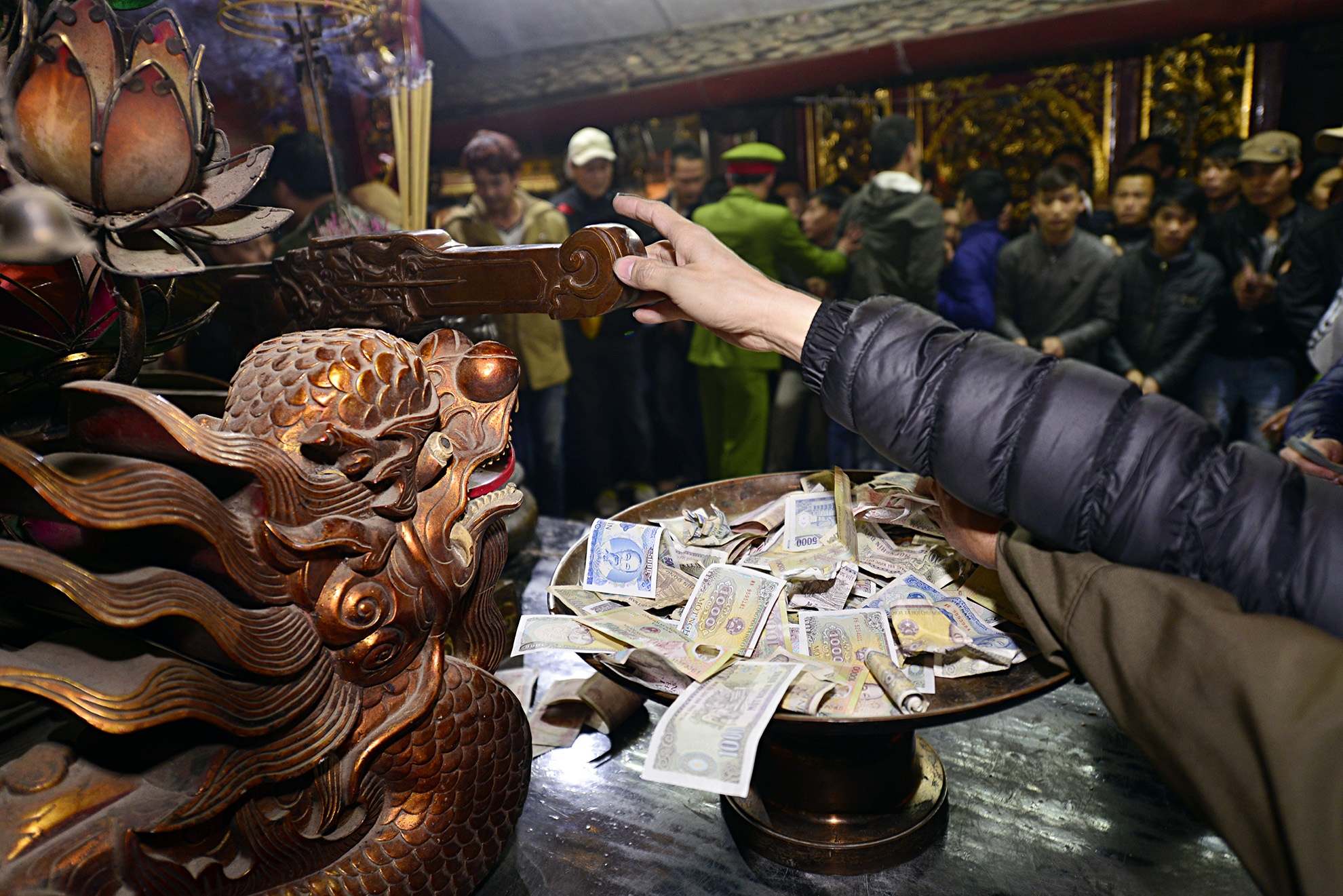 Cảnh tượng hỗn loạn, tiền lẻ rải rác khắp các ban thờ.