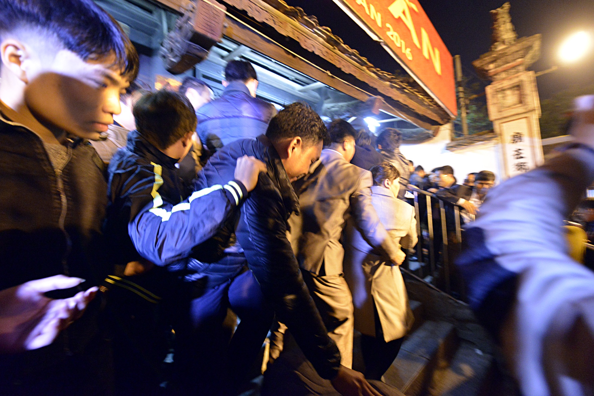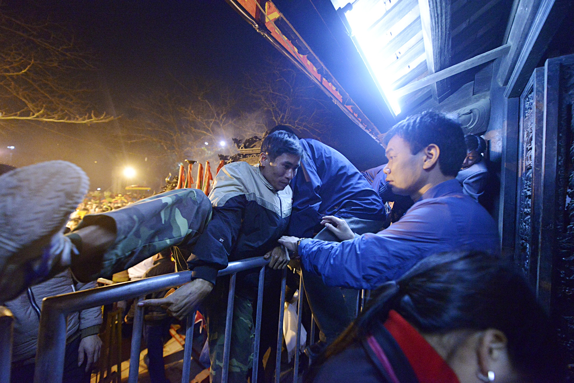 Khung cảnh tái diễn sự hỗn loạn như lễ khai ấn Đền Trần các năm trước. Rất nhiều người không đi theo hàng lối đã dựng sẵn mà leo trèo vào phía trong cho nhanh.