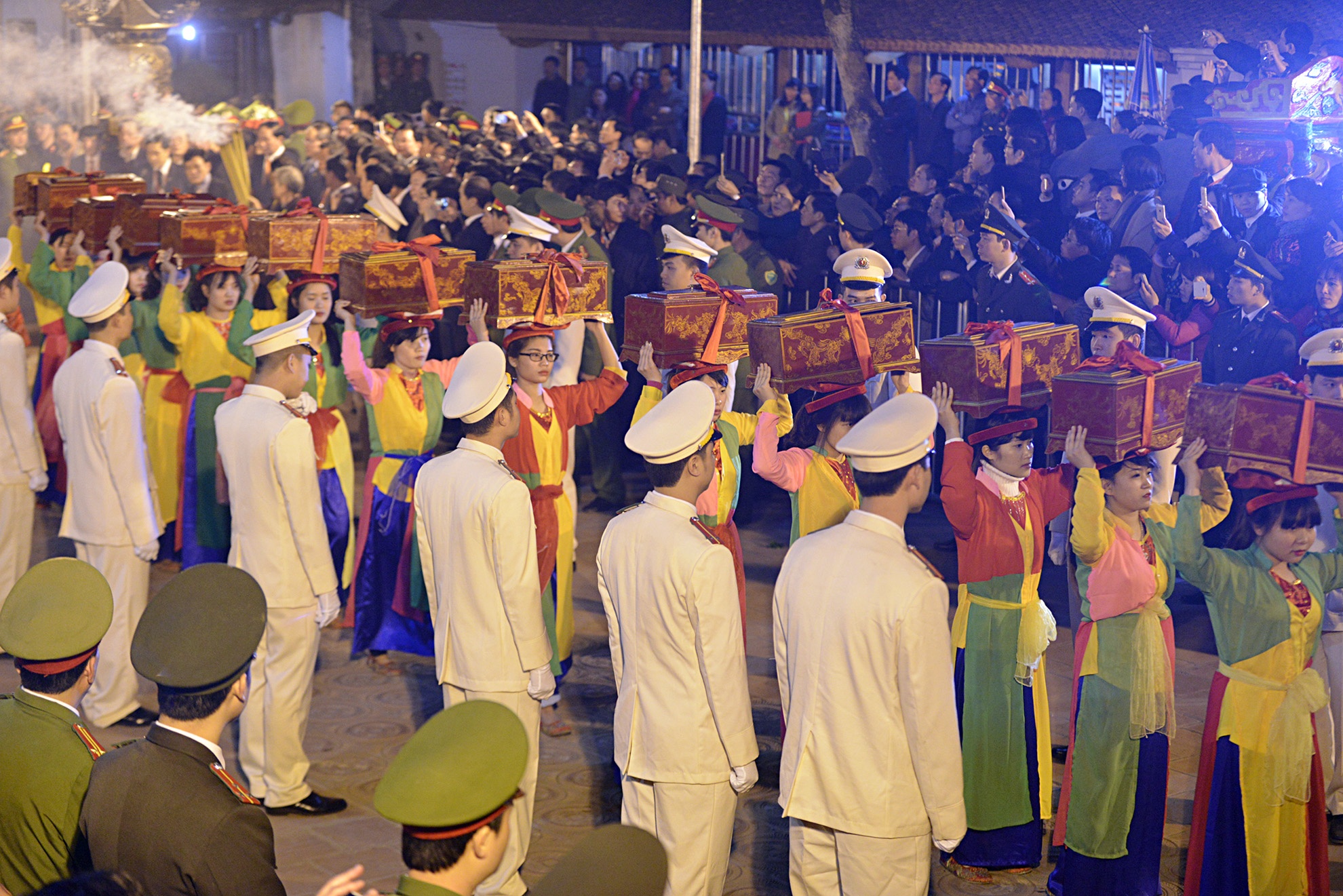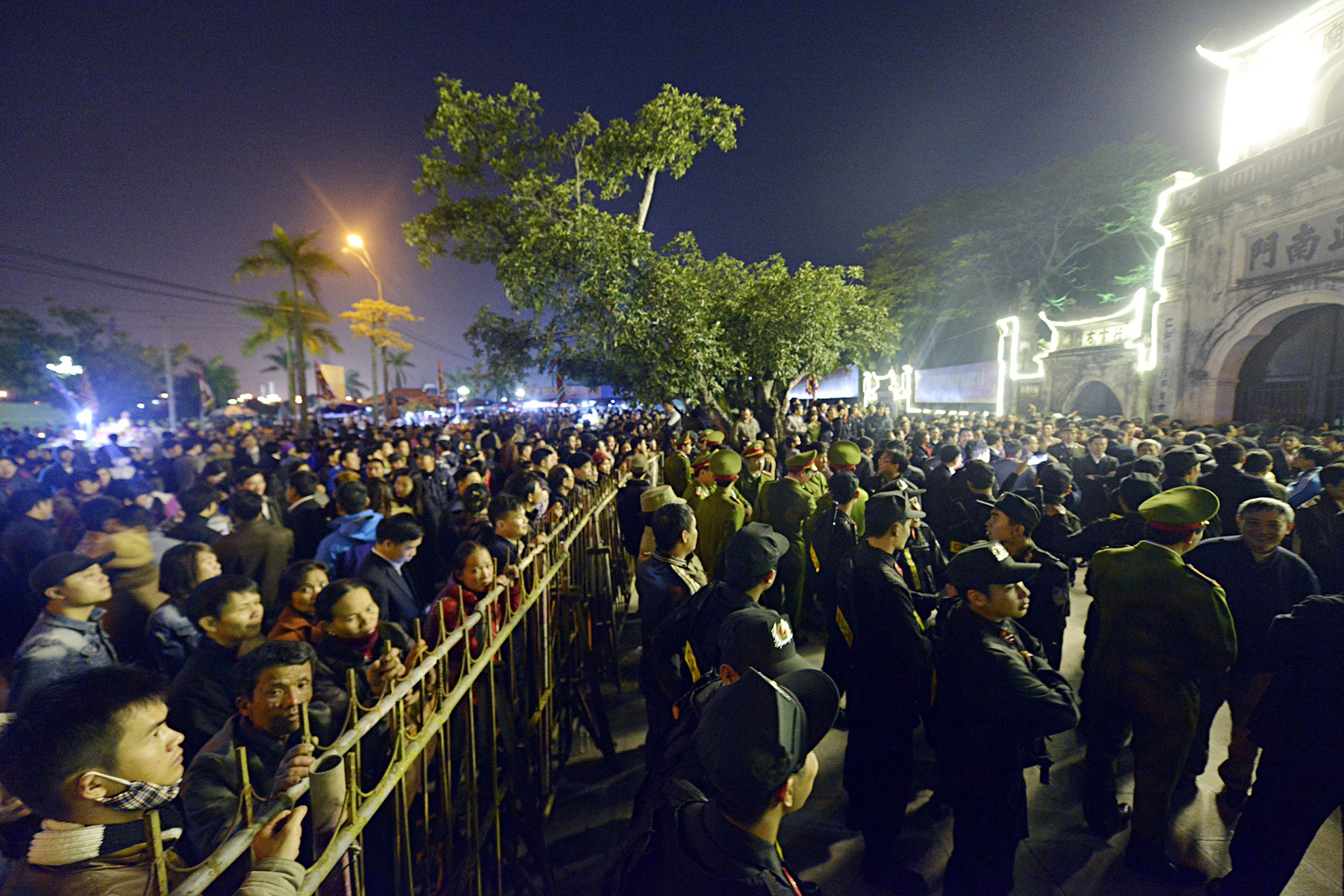 21h tối 21/2, lực lượng chức năng phong tỏa các con đường vào đền Thiên Trường thuộc Đền Trần (Nam Định). Chỉ những người nằm trong thành phần khách mời, có thẻ vàng, xanh, đỏ mới được vào bên trong tham dự. Phía ngoài hàng rào, hàng nghìn người dân chờ đợi.