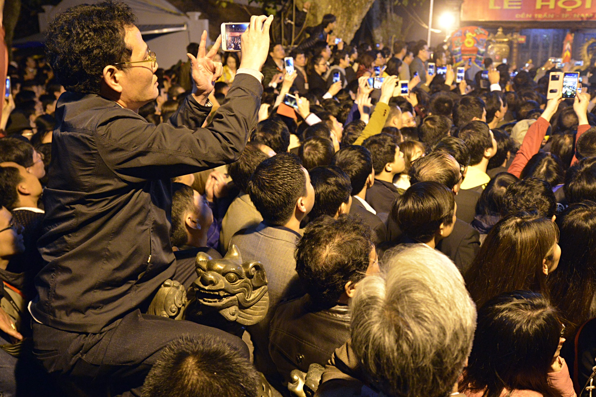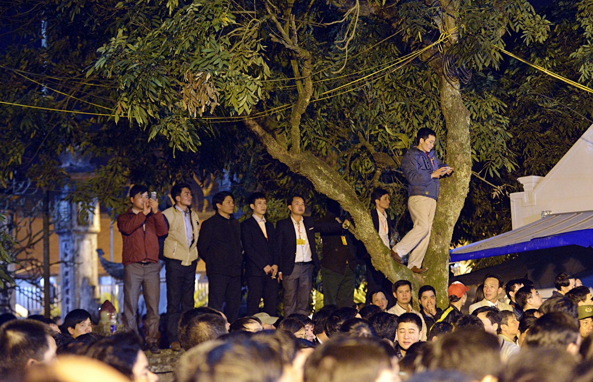 Nhiều người trèo lên những lư hương bằng đồng để quay phim, chụp ảnh lễ khai ấn.