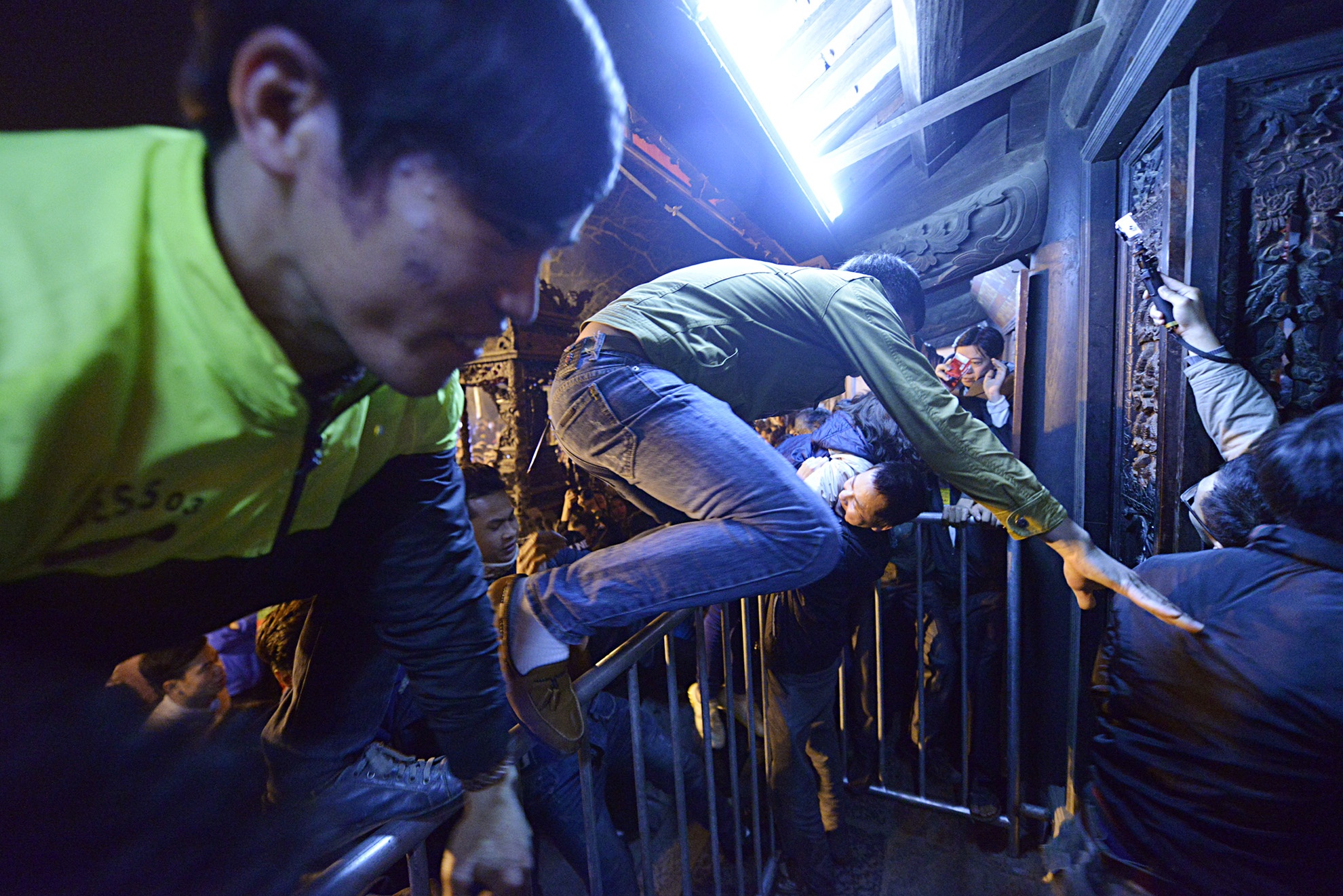 Mặc dù ban tổ chức lễ hội Đền Trần (Nam Định) đã phòng ngừa mọi tình huống không đẹp có thể xảy ra nhưng người tham dự đêm khai ấn vẫn trèo rào, nhảy bổ vào trong cướp lộc lấy may.