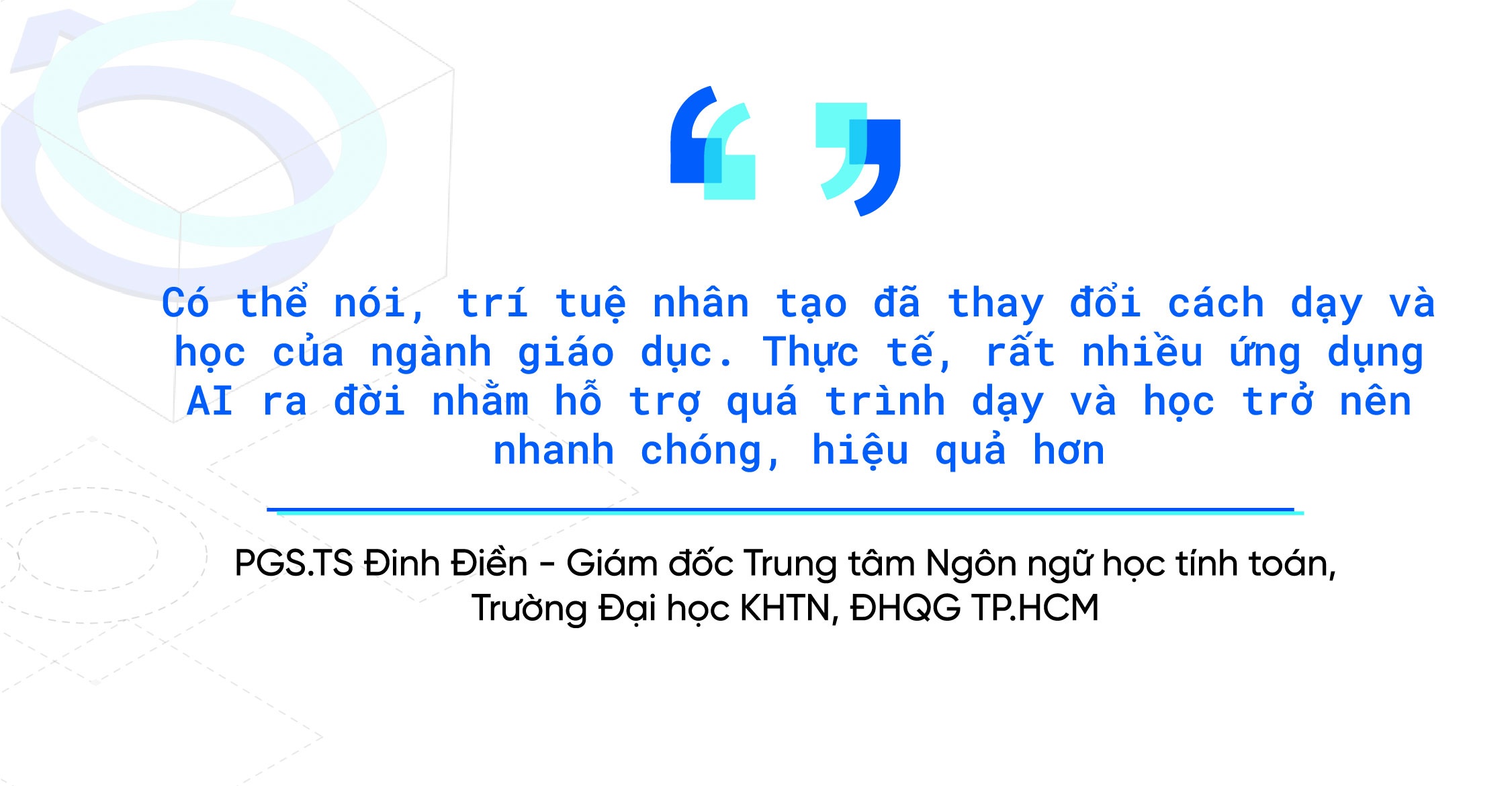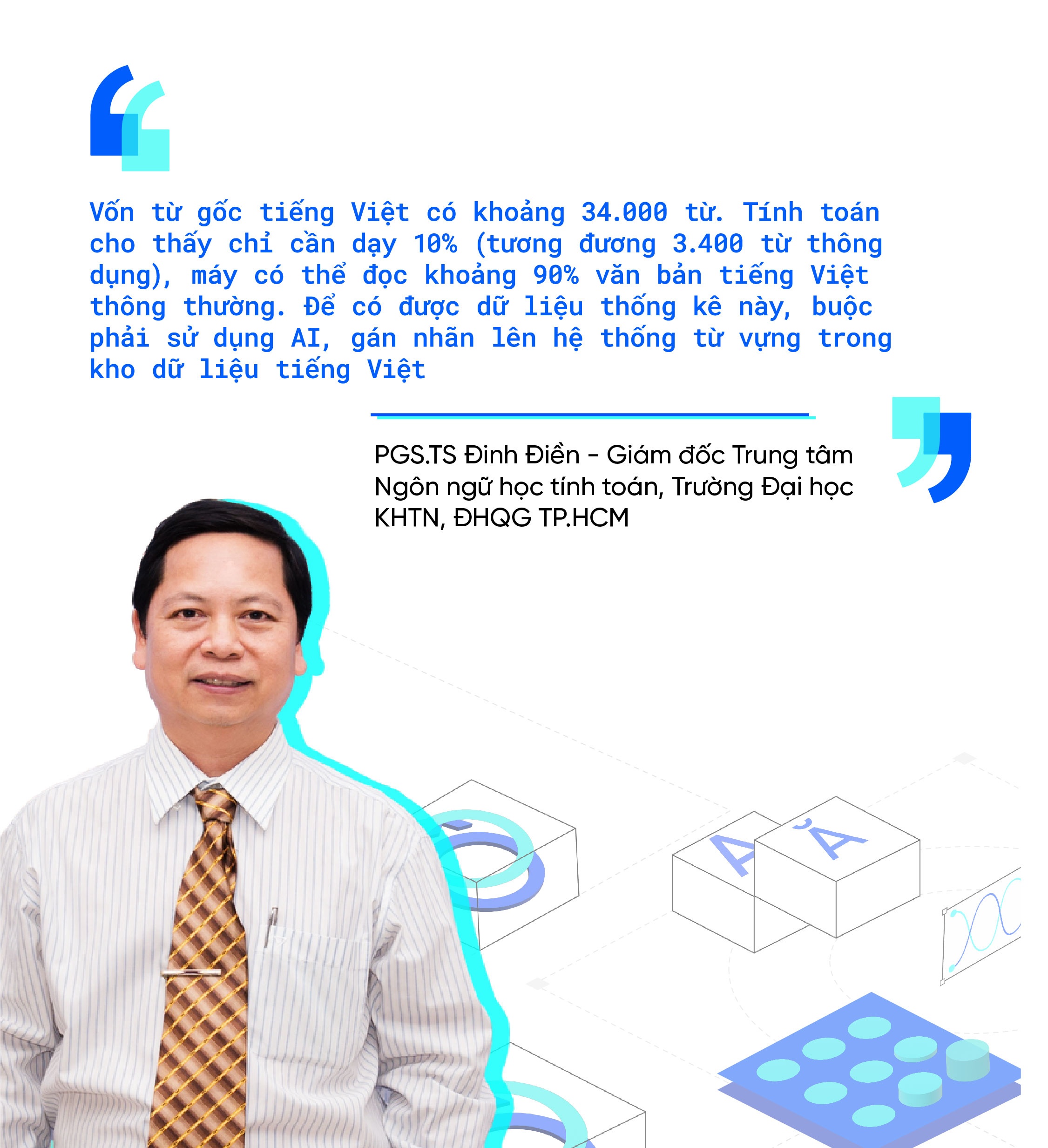 Là người có nhiều đề tài nghiên cứu khoa học, công trình công bố quốc tế về áp dụng trí tuệ nhân tạo (AI) trong dịch máy, ngôn ngữ học đối chiếu và dạy tiếng Việt cho người nước ngoài, PGS.TS Đinh Điền cho rằng việc ứng dụng AI đặc biệt cần thiết để giải quyết các vấn đề thuộc lĩnh vực ngôn ngữ học.