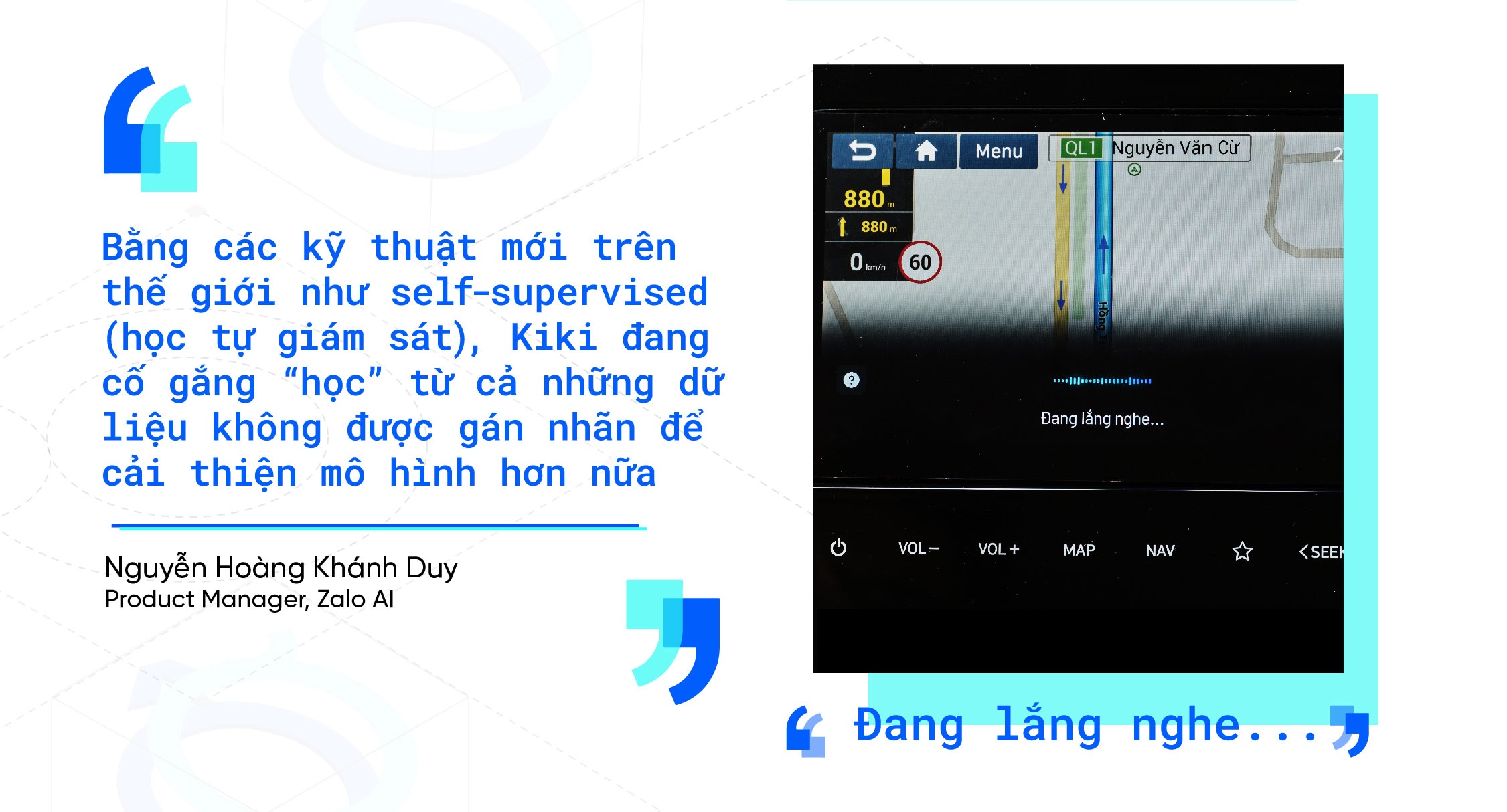 Đó là quá trình nghiên cứu và phát triển trợ lý giọng nói tiếng Việt Kiki trên ôtô, để nhận dạng tốt giọng nói với nhiều ngữ điệu vùng miền. Trong khoa học máy tính, nhận dạng giọng nói là một nhánh quan trọng của AI, giúp chuyển đổi giọng nói con người thành một định dạng hữu ích và có thể hiểu được bằng các ứng dụng máy tính. Công nghệ này là cầu nối tương tác giữa máy móc và con người. Trợ lý giọng nói đã trở thành ứng dụng không thể thiếu trên toàn thế giới, phổ biến nhất có thể kể đến Siri của Apple, Google Assistant, Amazon Alexa hay Kiki ở Việt Nam.