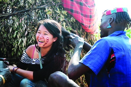 | Huyền Chip được một chàng trai châu Phi uốn tóc. |