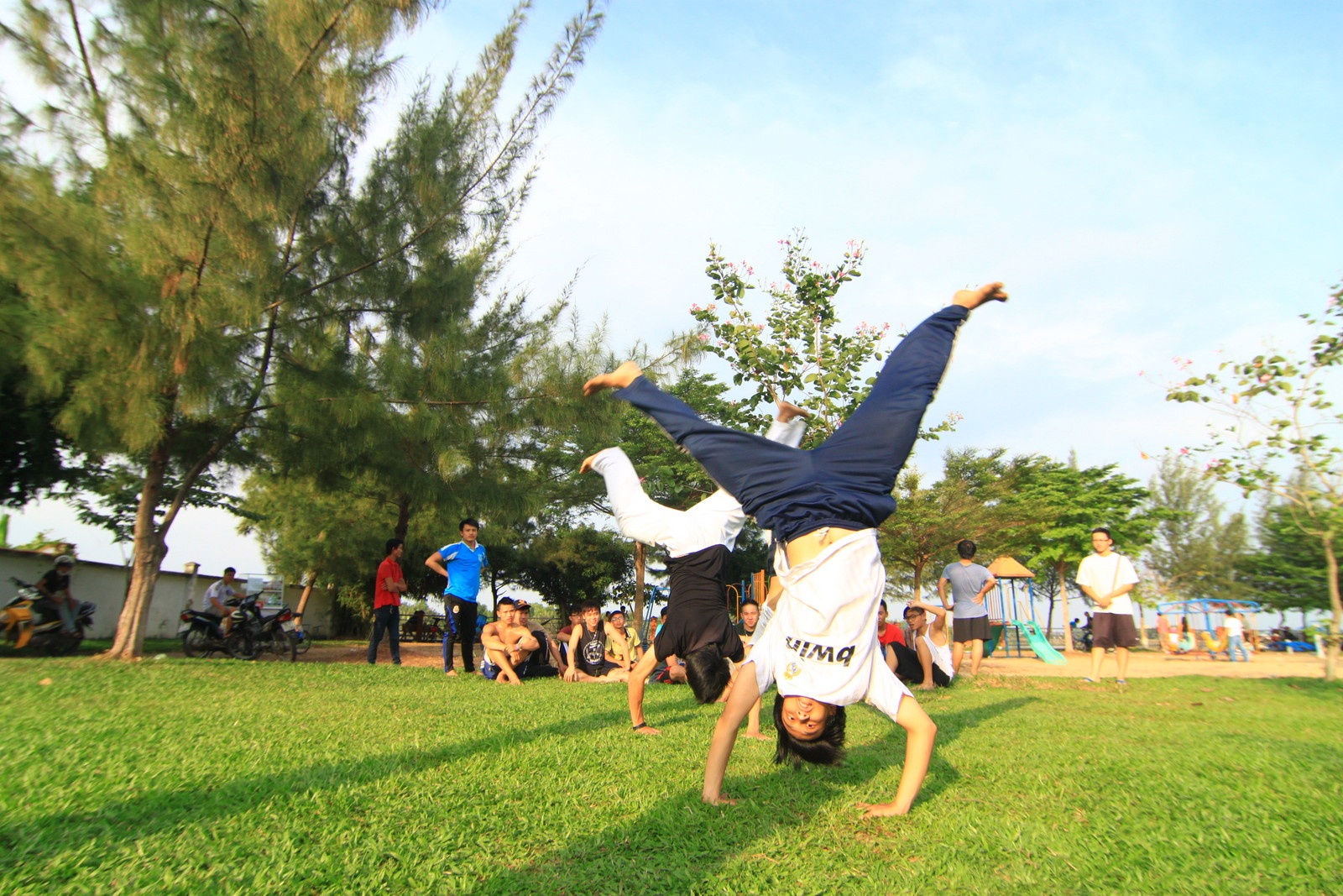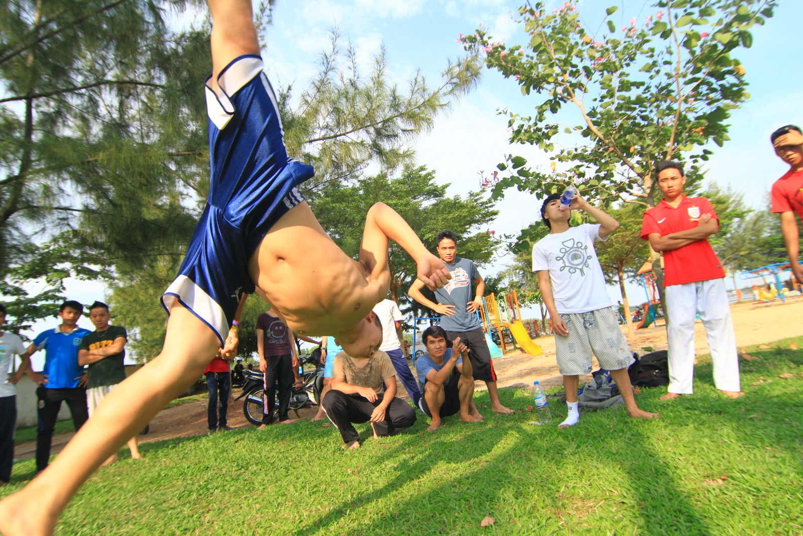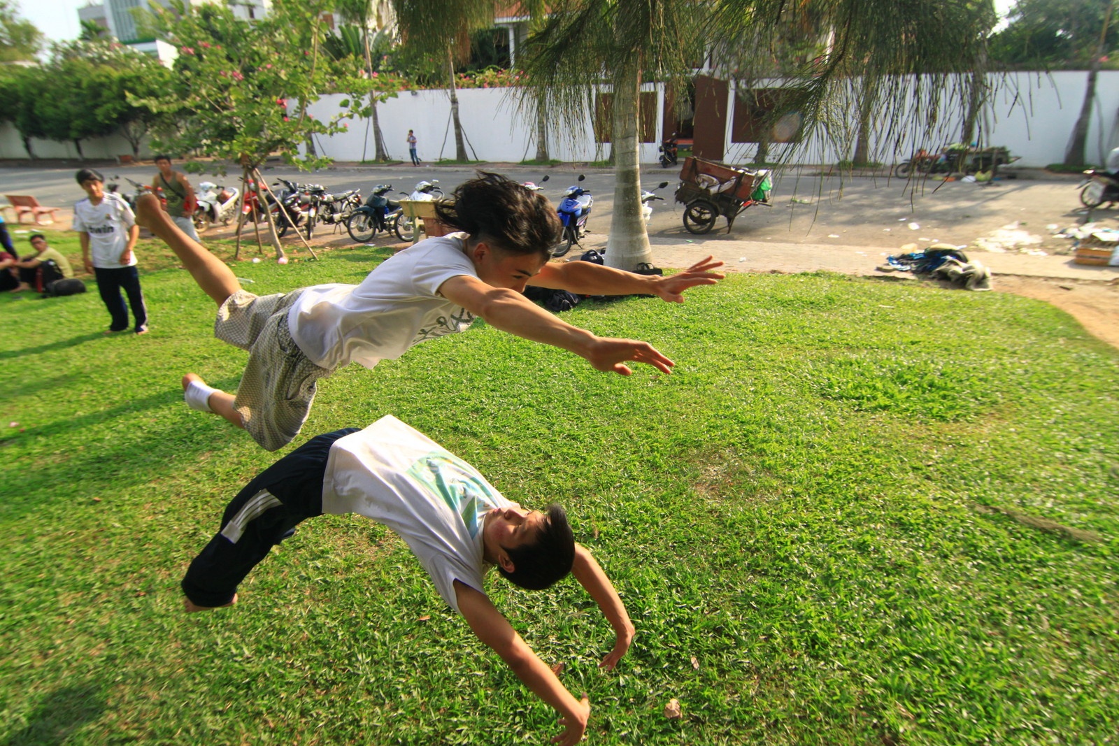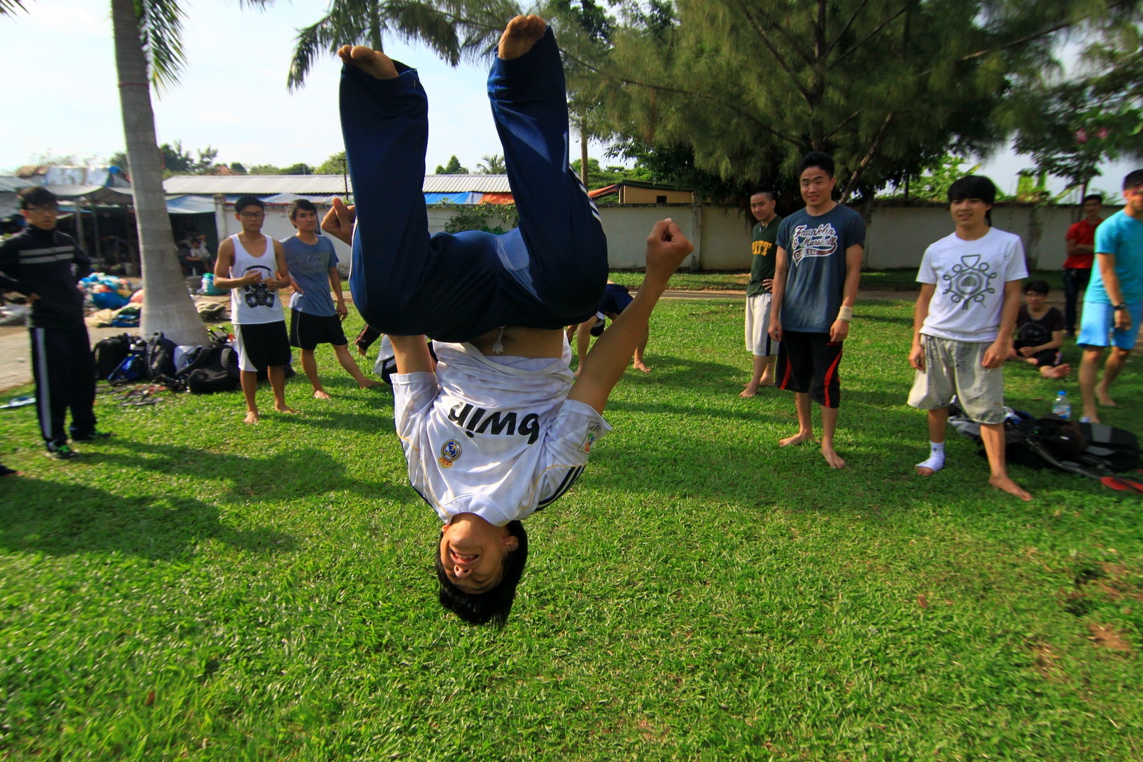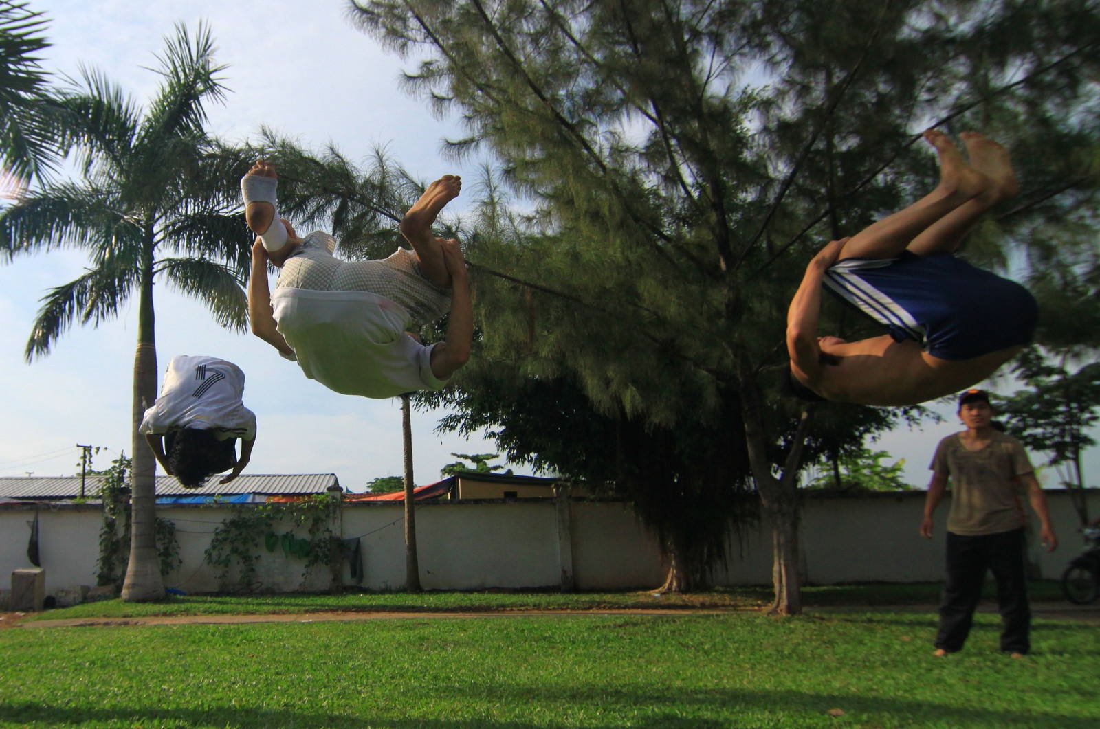 | Nhào lộn thành vòng trên thảm cỏ. Môn thể thao này yêu cầu phải tập luyện trên sân tập có nệm. Nhưng vì không có đủ tiền thuê sân nên các thành viên tìm đến những nơi có thảm cỏ, bãi cát, nếu không thì nhóm phải tập ở nền xi măng. |