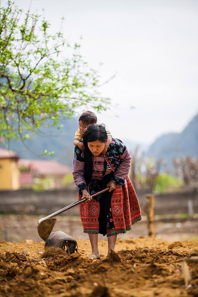 Ảnh Réhahn chụp một cô gái người Mông ở Mộc Châu, Sơn La vừa làm việc vừa chăm con. |
