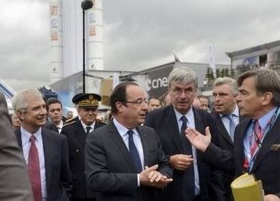 Tổng thống Pháp Francios Hollande thăm quan triển lãm năm 2013. Phía sau lưng ông là tên lửa Arian 5.