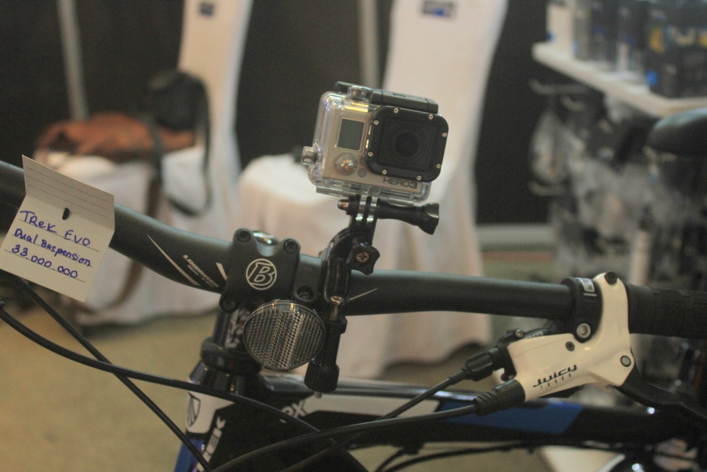 | Vòng quanh triển lãm, người xem cũng bắt gặp một số thiết bị độc đáo. Trong ảnh là thiết bị ghi hình cho xe đạp, dù lượn gắn phía trước. |