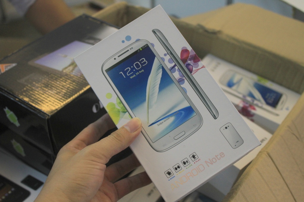 | Một mẫu Galaxy Note "nhái" đang được mở hộp để trưng bày trước khi triển lãm mở cửa. |