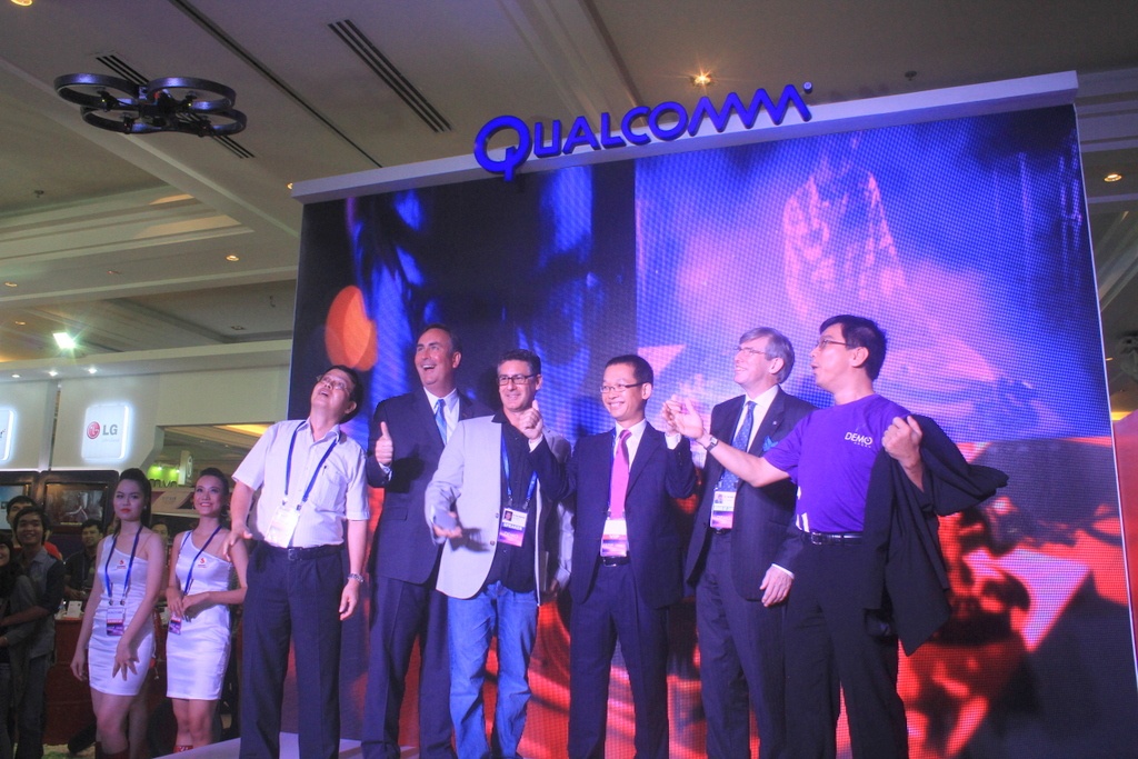 | Các nhà tổ chức đứng trên sân khấu, hứng khởi với thiết bị bay điều khiển bằng smartphone chạy chip Qualcomm. |