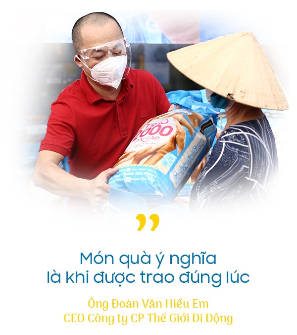 Ông Đoàn Văn Hiểu Em, CEO Công ty CP Thế Giới Di Động, chia sẻ: “Dịch bệnh tác động quá lớn đến đời sống bà con. Trụ được qua giai đoạn gian nan, nhiều gia đình cần nhất bữa cơm no. Mong muốn góp phần nhỏ xoa dịu nỗi cơ cực của bà con đã thôi thúc chúng tôi gấp rút chuẩn bị chương trình ngay trong dịch, nhằm triển khai khi vừa hết giãn cách”.