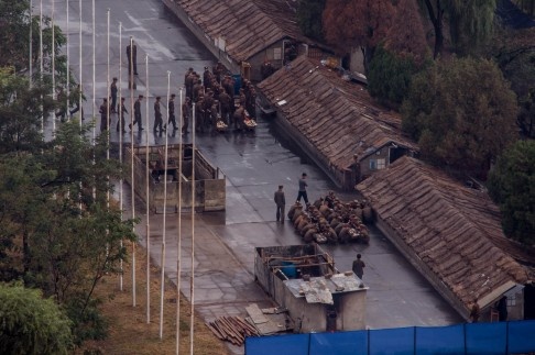 Các binh sĩ Triều Tiên tiến về quảng trường Kim Nhật Thành ở Bình Nhưỡng sáng nay. Theo Yonhap ngày 10/10, buổi lễ kỷ niệm 70 năm ngày thành lập đảng Lao động Triều Tiên dự kiến diễn ra lúc 10h (8h giờ Hà Nội) nhưng phải hoãn do trời mưa và có thể sẽ diễn ra vào chiều nay. Hiện tại, các phóng viên nước ngoài đang ở một khách sạn để đưa tin. Ảnh: CFP