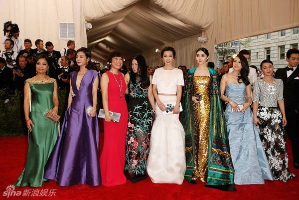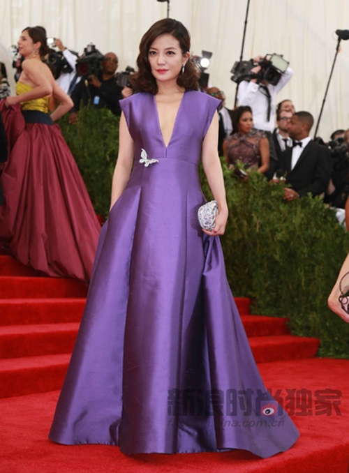 | Khác với hình ảnh đời thường khi đi dạo phố New York và mua sắm cùng nhau, Triệu Vy (váy tím) và Phạm Băng Băng (váy vàng) "lột xác" khi xuất hiện cùng dàn sao Hoa ngữ trên thảm đỏ Met Gala ngày 4/5. |