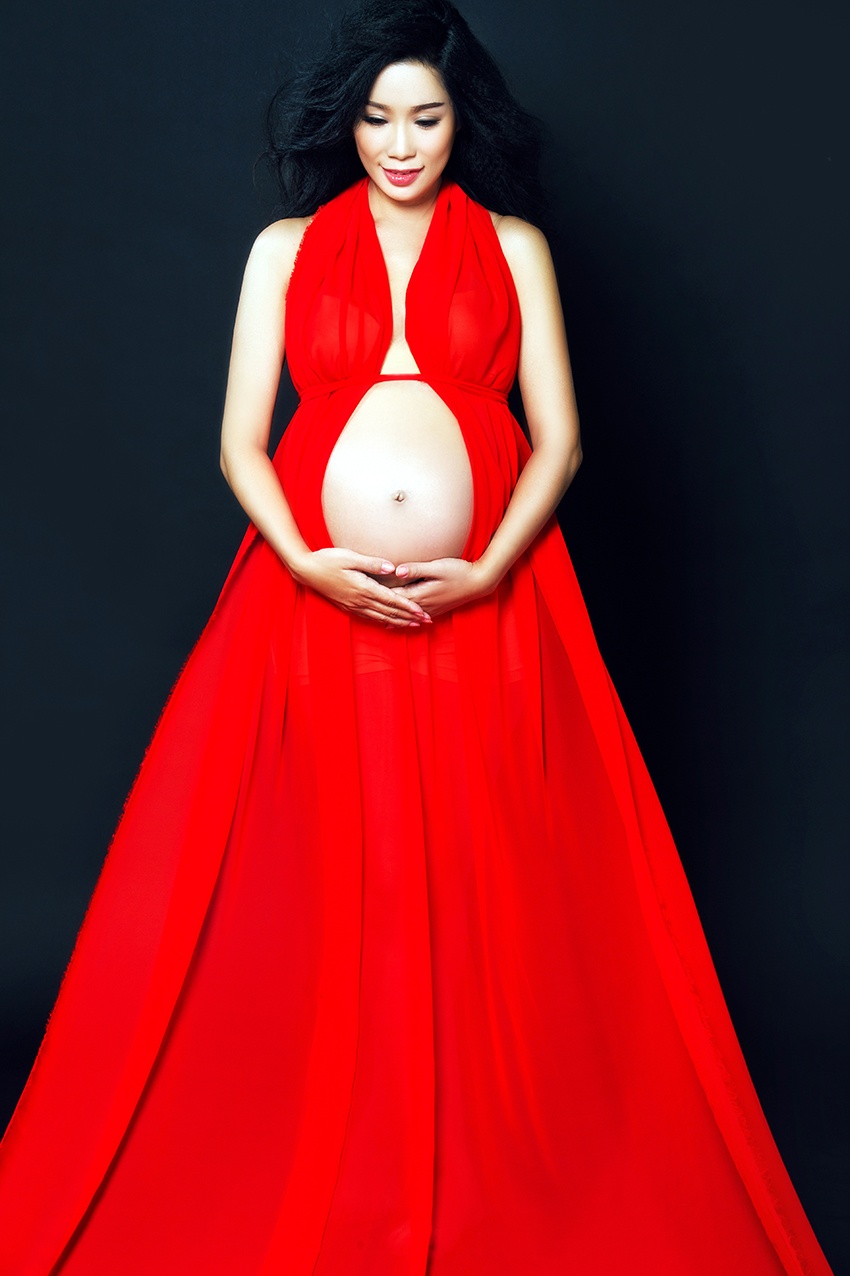 Ngoài trang phục áo crop-top dành cho thai phụ, á hậu Việt Nam 1994 còn diện đầm dạ hội thiết kế riêng. Trong ảnh, mẫu váy tông đỏ bắt mắt giúp bà mẹ sinh năm 1972 khoe khéo bụng bầu 9 tháng.