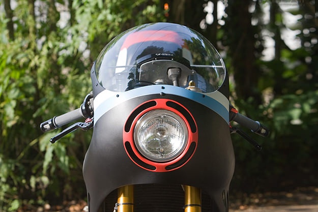 Nhóm thợ của Kev Taggart và Tim Roger đã nghĩ đến việc tái thiết kế dàn áo theo phong cách Retro-GP, kết hợp cùng những chiếc xe ở giải đua Moto2. Dàn áo và chỗ ngồi phía sau được thiết kế và sản xuất hoàn toàn thủ công bởi chuyên gia thiết kế các chi tiết cổ điển cho xe hơi, Ian Pitney. Mặc dù đây là lần đầu tiên Ian thiết kế cho xe máy, nhưng nó cũng rất ấn tượng.