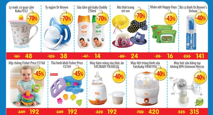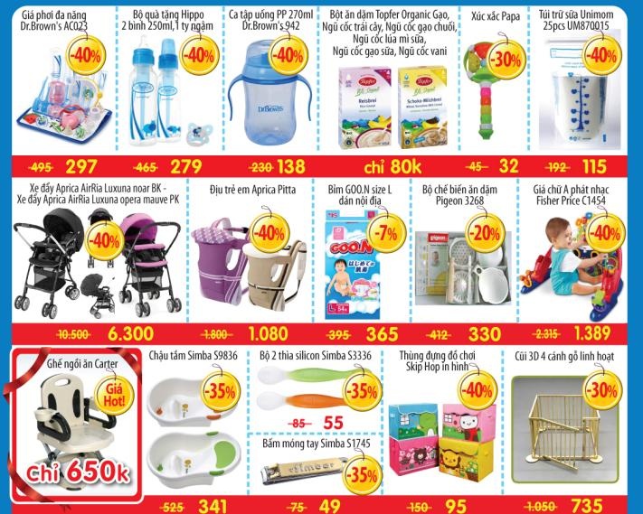 - Giảm tới 40% cho xe đẩy, bộ túi cho mẹ, thùng đựng đồ chơi.