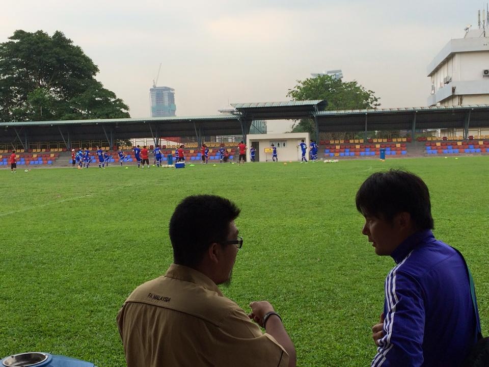 | HLV Miura khá đăm chiêu trước buổi tập thứ 2 của Olympic Việt Nam tại Malaysia. Ngày 24/3, BTC bố trí Olympic Việt Nam tập buổi sáng và Olympic Nhật Bản tập buổi chiều cùng trên sân 3K Inn & Sports Complex. |