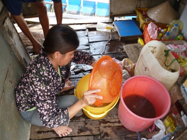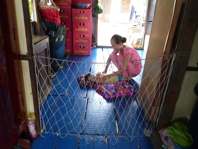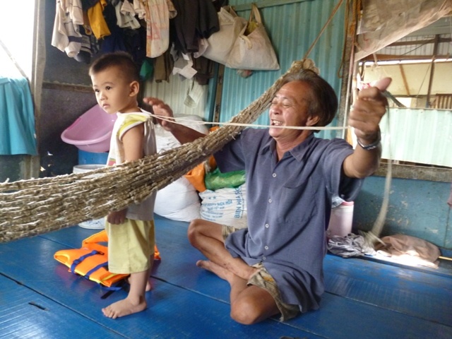 Bất kể khi ngủ hay chơi, trẻ em xóm vạn luôn được bố mẹ dùng dây cột vào mạn thuyền để khỏi rơi xuống nước.
