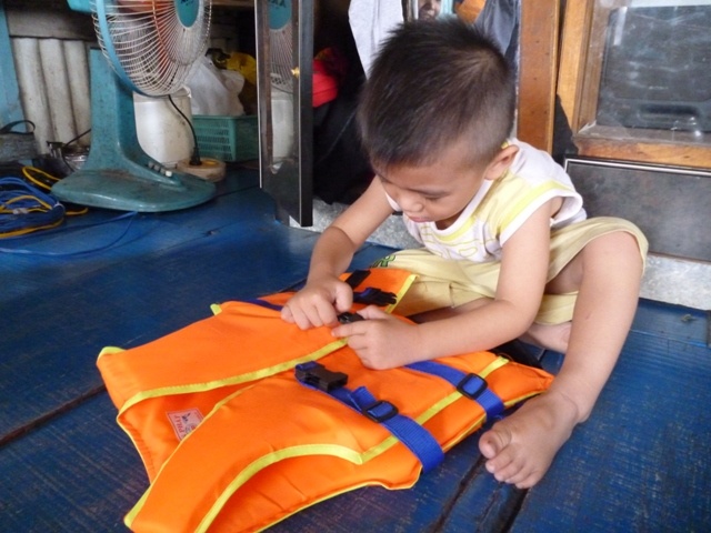 | Nhà nào có điều kiện thì trang bị áo phao cho trẻ em. Tuy mỗi chiếc áo phao chỉ 40.000 - 50.000 đồng nhưng đối với người dân vạn chài, đó là số tiền không dễ gì kiếm được trong một ngày. |